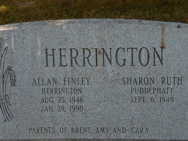 Allen Finlay Herrington was born on 25 August 1946 at Brighton Twp., Northumberland Co., Ontario; Date Aug 25 1946 per Memorial & CEMSearch. per CEMSearch record for William Esli Herrington.1,2 He died on 29 January 1990 at Ontario at age 43; Date Jan 29 1990 per Memorial & CEMSearch.1,2 He was buried on 3 February 1990 at Burnbrae Cemetery, Seymour Twp., Northumberland Co., Ontario; Memorial: (See Exhibit) HERRINGTON; Allan Finley; Herrington; Aug. 25, 1946; Jan. 29, 1990; Sharon Ruth; Puddephatt; Sept. 6, 1949 - (Burnbrae Cemetery, Seymour Twp., Aug 11 2006)