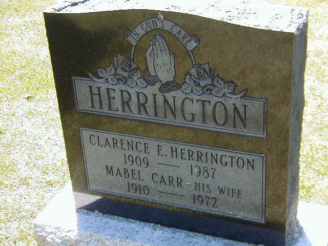 CEMSearch: Name: Clarence E. Herrington; Born: 1909; Died: 1987; Age: 78y; Notes: Husband of Mabel Carr; Buried: Waite Cemetery, Cramahe Twp; Other names: Mabel Herrington (Carr) (1910-1972.)7,5