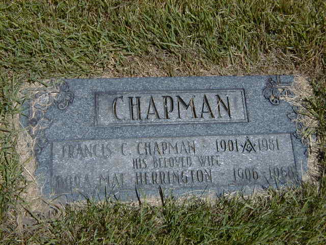 Francis Clifford Chapman was born on 15 July 1901 at Cramahe Twp., Northumberland Co., Ontario; Birth Reg'n.#028544: Name: Chapman, Francis Clifford; Date: Jul 15 1901; Parents: Frank Chapman & Florence E. McDonald; Inf.: F. J. Chapman, farmer, Cramahe; Phys.: Dr. Hewson; Reg'd.: Sep 2 1901; Reg'r.: Chas. A. Wilson, Cramahe Twp. (Ontario Birth Registration, #028544-1901, ancestry.com) Date 1901 per Memorial. Date 1902 & location Ont. per 1921 Census. per family tree of Barmardon72 on ancestry.com, Dec 16 2014. per GEDCOM of Barbara Lenker, July 31, 2004.1,4,2,5,6 He appeared on the census of 9 June 1921 at Cramahe Twp., Northumberland Co., Ontario; Age 19 at 1921 Census: see Frank Chapman.5 He married Dora May Herrington, daughter of Alonzo Herrington and Caroline "Carrie" Genereaux, on 24 August 1929 at Ontario; per family tree of Barmardon72 on ancestry.com, Dec 16 2014. per GEDCOM of Barbara Lenker, July 31, 2004.1,4 Francis Clifford Chapman died on 7 September 1981 at Ontario at age 80; Date 1981 per Memorial. per family tree of Barmardon72 on ancestry.com, Dec 16 2014. per GEDCOM of Barbara Lenker, July 31, 2004.1,4,2 He was buried on 10 September 1981 at Waite's Cemetery, Cramahe Twp., Northumberland Co., Ontario; Memorial: (See Exhibit) CHAPMAN; Frances C. Chapman 1901 - 1981; His Beloved Wife; Dora Mae Herrington 1906 - 1968 (Waite's Cemetery, Cramahe Twp., Jul 3 2004.)2