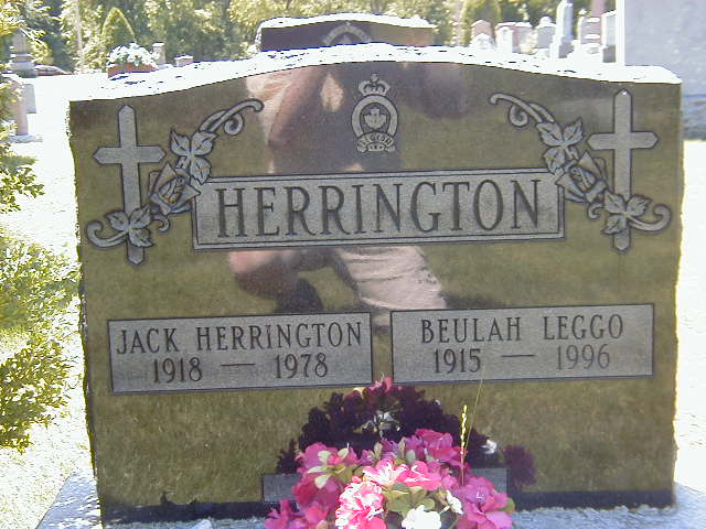 Jack Herrington was born on 6 July 1918 at Brighton Twp., Northumberland Co., Ontario; Date 1918 per Memorial & CEMSEarch. Date 1919 & location Ont. per 1921 Census. Date Jul 6 1918 per GEDCOM of Barbara Lenker, July 31, 2004.1,3,2,4 He appeared on the census of 1921 at Brighton Twp., Northumberland Co., Ontatio; Age 2 at 1921 Census: see Alonzo Herrington.2 He married Beulah Leggo after 1945; per Memorial.3,4 Jack Herrington died on 21 February 1978 at age 59; Date 1978 per Memorial. Date Feb 21 1978 per GEDCOM of Barbara Lenker, July 31, 2004.1,4 He was buried on 23 February 1978 at Waite Cemetery, Cramahe Twp., Northumberland Co., Ontario; Memorial: (See Exhibit) HERRINGTON; Jack Herrington; 1918 - 1978; Buelah Leggo; 1915 - 1996 (Waite's Cemetery, Cramahe Twp., Jul 3 2004)