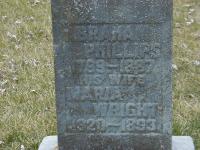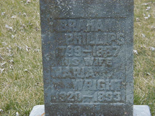 Note: No wife shown here; maybe this is around 2nd marriage.7 He married Maria Wright, daughter of David Wright and Sarah Mumford, before 1842 at Northumberland Co., Canada West; Census record for 1840 showns no wife?? Maria Wright per Burial.5 Abraham Phillips appeared on the census of 1850 at Conc 6 Lot 36, Murray Twp., Northumberland Co., Canada West; 1850 Census: Abraham Phillips; Conc 6, Lot 36, occupied, prop; Total 10 persons (Newcastle District Census & Assessment Records, Murray Twp.)7 He appeared on the census of March 1852 at Brighton Twp., Northumberland Co., Canada West; Age 53 at 1851 Census: Philips, Abraham, 53, b. Cda., EM, Innkeeper, married; Maria, 30, b. England, EM, married; ?(m), 13; William, 11; George, 9; Mary, 5; Mary??(f), 3; Robert, 1; Cole, Richard, 14, b. Cda., lab.8 He appeared on the census of April 1861 at Brighton Twp., Northumberland Co., Ontario; Age 60 at 1861 Census: Phillips, Abraham, 60, b UC, EM, Inkeeper, married; Maria, 37, b England, EM, married; E.(m), 21, b. UC, lab., single; M.(f), 12; Robt., 10; Ambrose, 8; Horace, 6; H. 2.5 He lived in April 1861 at Conc 6 Lot 36, Brighton Twp., Northumberland Co., Ontario; Residence per 1861 Census: Abraham Phillips; Conc 6, Lot 36, south 1/2, 100 acres.5 He lived in April 1871 at Conc 6 Lot 36, Brighotn Twp., Northumberland Co., Ontario; Residence per 1871 Census: Conc 6, Lot 36, Brighton Twp., 50 acres, owner.9 He appeared on the census of April 1871 at Brighton Twp., Northumberland Co., Ontario; Age 72 at 1871 Census: Phillips, Abraham, 72, b. Ont., Irish, C. M., farmer, married; Meriah, 49, b. England, Eng., CM, married; Robert, 20, b. Ont., Irish, farmer; Ambrose, 19; Henrietta, 14; Horrison?, 17; Abraham, 10; Wheeler, Maria, 3, b. US, Irish (C-9985, div. 3, pg. 8, line 4 - Conc 6, Lot 36, 50 acres, owner.)9 He appeared on the census of April 1881 at Brighton Twp., Northumberland Co., Ontario; Age 83 at 1881 Census: Phillips, Abraham, 83, b. Ont., irish, EM, farmer, married; Maria, 55, b. England, Eng., EM, married; Robert, 29, b. Ont., Irish, EM, farmer, single; Abraham, 20, b. Ont., irish, EM, farmer, single; Wheeler, Maria, 13, b. Ont., Irish, EM (familysearch.org.)4 He died on 3 February 1888 at Percy Twp., Northumberland Co., Ontario, at age 86; Death Reg'n.#012117: Name: Abraham Philips; Date: Feb 3 1888; Age: 89; Occ.: farmer; Born: Ont; Cause: old age, 3 weeks; Phys.: A.D. Richards, MD; Inf.: Abraham Philips, Percy Twp; Reg'd.: Feb 6 1888; Rel.: Meth; Reg'r.: R.P. Hurlbut, Percy Twp. (Ontario Death Registration, #012117-1888, ancestry.ca) Date 1887 per Memorial.2,10 He was buried on 5 February 1888 at McPhail's Cemetery, Brighton Twp., Northumberland Co., Ontario; Memorial: (See Exhibit) Abraham Phillips; 1799 - 1887; His wife; Maria; Wright; 1820 - 1893 (McPhail's Cemetery, Brighton Twp., June 4, 2005)