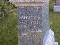 CemSearch: Name: Margaret M. Clark; Maiden: Weller; Born: Oct 5 1870; Died: 1930; Age: 60y; ID: WOODS092; Other names: Clark, George W. Lawson (1910-1914), Clark, John A. (1862-1936), Clark, Sarah A. (1842-1908), Clark, Thomas (1834-1906); Cemetery: Woods Cemetery, Conc 1, Lot 12, Cramahe Twp., Northumberland Co., Sec S Row 14 Plot 13; Note: Wife of John A. Clark married Jan 18, 1888, Dau of Henry Weller and Rebecca (Ainsworth) Weller, Info from Ontario Birth and Marriage Registry. (https://www.cemsearch.ca/burial/?pid=WOODS092%5E4.)3,4