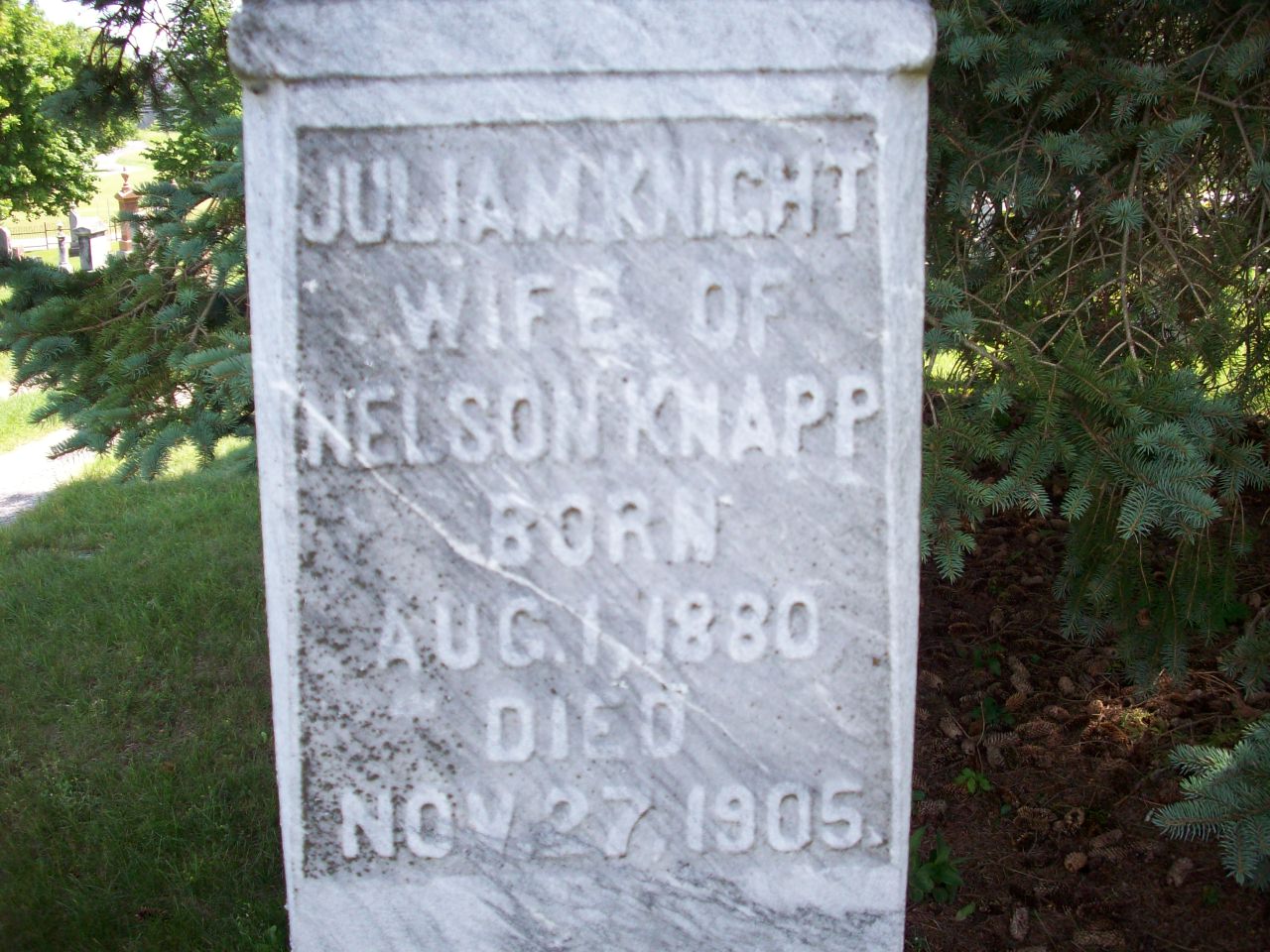 CemSearch: Name: Julia M. Knapp; Maiden: Knight; Born: Aug 1 1880; Died: Nov 27 1905; Age: 25y 3m; ID: CSTLTN095; Other names: Knapp, Anna [Philip] (1843-1924), Knapp, James Wesley (1875-1898), Knapp, Marshall (1841-1920), Knapp, Mary Lena (1872-1892); Cemetery: Castleton Cemetery, Conc 7, Lot 32, Cramahe Twp., Village of Castleton, Northumberland Co., Sec A-S Row 9 Plot 13; Note: Married Nelson Knapp Dec 21 1904 in Haldimand Twp. Born & died Cramahe Twp. Died of confinement. Methodist. Info from Cramahe Death Register. Daughter of William K. Knight and Martha Bonney. Additional information from Northumberland and Durham Marriage Records. (https://www.cemsearch.ca/burial/?pid=CSTLTN095%5E4.)3,5