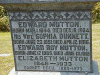 Edward Mutton was born on 1 March 1844 at Cramahe Twp., Northumberland Co., Canada West; Date March 1 1844 & location Cramahe Twp. per Death Reg'n. Date Mar 1844 & location Ont. per 1911 Census. Date Mar 1 1844 & location Ont. rural per 1901 Census. Date 1844 & location Ont. per 1891 Census. Date 1845 & location Ont. per 1871 Census. Date 1844 & location UC per 1861 Census. Date 1843 & location Cda. per 1851 Census. Date Mar 1 1844 per CEMSearch. Date Mar 1 1844 from page 6 of "Ours To Remember" by Mary Ann Down, given to me by Shirley (Goodfellow) Bird, Sep. 3, 2004.1,2,3,4,5,6,7,8,9 He appeared on the census of 1852 at Cramahe Twp., Northumberland Co., Canada West; Age 8 at 1851 Census: see William Mutton.3 He appeared on the census of April 1861 at Cramahe Twp., Northumberland Co., Canada West; Age 17? at 1861 Census: see William Mutton.4 He appeared on the census of April 1871 at Cramahe Twp., Northumberland Co., Ontario; Age 26 at 1871 Census: see William Mutton.5 He married Sophia Dunnett, daughter of Robert Dunnett and Mary Philp, on 15 February 1879 at Northumberland Co., Ontario; Date Feb 15 1879 from page 6 of "Ours To Remember" by Mary Ann Down, given to me by Shirley (Goodfellow) Bird, Sep. 3, 2004.1 Edward Mutton "Seven years after marriage, at the age of thirty-four, Sophia died of tuberculosis, leaving three little sons; Wallie, Garnet, and Roy who was a baby ten months old. Edward's sister, Libbie, came to live with him and took care of his family." from page 20 of "Ours To Remember" by Mary Ann Down, given to me by Shirley (Goodfellow) Bird, Sep. 3, 2004. on 12 April 1886 at Cramahe Twp., Shiloh, Northumberland Co., Ontario.1 He appeared on the census of April 1891 at Cramahe Twp., Northumberland Co., Ontario; Age 47 at 1891 Census: Mutton, Edward, 47, b. Ont., p.b. England, Meth., farmer, widower; William Wallace, 10, b. Ont., p.b. Ont., Meth; Garnet Cecil, 8; Edward Roy, 5; Elizabeth, 44, b. Ont., p.b. England, Meth., housekeeper, sister, single (1891 Census: Cramahe Twp., Northumberland Co., dist. 89, sub-dist. e, pg.l 24, line 21 - ancestry.com.)7 He appeared on the census of 19 April 1901 at Cramahe Twp., Northumberland Co., Ontario; Age 57 at 1901 Census: Mutton, Edward, 57, b. Ont. r. Mar 1 1844, Eng., Meth., farmer, widower; William W., 20, b. Ont. r. Oct 8 1880, Eng., Meth., son, farmer, single; Garnet C., 18, b. Ont. Feb 29? 1883, son; Edward R., 15, b. Ont. r. Jun 17 1885, son; Elizabeth, 54, b. Ont. r. May 12? 1846, sister, single (1911 Census: Cramahe Twp., Northumberland Co., dist. 95, sub-dist. e-3, pg. 10, line 46 - ancestry.com.)9 He lived in 1902 at Cramahe Twp., Dundonald, Northumberland Co., Ontario; "About 1902 they moved to Dundonald and bought the Austin Dudley place." from page 20 of "Ours To Remember" by Mary Ann Down, given to me by Shirley (Goodfellow) Bird, Sep. 3, 2004.1 He appeared on the census of 1911 at Cramahe Twp., Northumberland Co., Ontario; Age 67 at 1911 Census: Mutton, Edward, 67, b. Ont. Mar 1844, Eng., Meth., farmer, widower; Elizabeth, 65, b. Ont. May 1846, Eng., Meth., sister, single; Cecil G., 28, b. Ont. Feb 1883, son, Eng., Meth., farmer, single; Roy E., 25, b. Ont. Jun 1886, Eng., Meth., son, single; Dickonson, ?(f), 19, b. Ont. Sep 1892, domestic, single (1911 Census: Cramahe Twp., Northumberland Co., dist. 107 - 7, sub-dist. 9-3, pg. 5, line 16 - ancestry.com.)9 He lived in 1911 at Conc 4 Lot 20, Cramahe Twp., Northumberland Co., Ontario; Residence per 1911 Census: Conc 4, Lot 20, Cramahe Twp.9 He died on 16 December 1924 at Cramahe Twp., Northumberland Co., Ontario, at age 80; Death Reg'n.#023632: Name: Edward Mutton; Date: Dec 16 1924; Age: 80y 9m 16d; REs.: Cramahe Twp; Born: Cramahe Twp., Mar 1 1844; Status: widowed; Occ.: farmer; Parents: William Mutton & Belinda Philp, both born Cornwall, England; Cause: lumbago; Phys.: J. Archer Brown, Colborne; Inf.: Garnet Mutton, RR1, Colborne, son; Burial: Shiloh Cemetery, Dec 18 1924; Und.: E. Quinn, Colborne; Reg'd.: Dec 17 1924 (Ontario Death Registration, #023632-1924, ancestry.com) Date Dec 16 1924 per CEMSearch. Date Dec 16 1924 from page 6 of "Ours To Remember" by Mary Ann Down, given to me by Shirley (Goodfellow) Bird, Sep. 3, 2004.1,2,6 He was buried on 18 December 1924 at Shiloh Cemetery, Cramahe Twp., Shiloh, Northumberland Co., Ontario; Memorial: (See Exhibit) Edward Mutton; Born Mar 1, 1844 Died Dec 16, 1924; His Wife Sophia Dunnett; Born June 23, 1851 Died Apr 12 1886; Edward Roy Mutton; Born June 17 1885 Died June 13 1915; Elizabeth Mutton; 1846 - 1933; Garnet Cecil 1883 - 1973 (Shiloh Cemetery, Cramahe Twp., Sept. 4, 2004)