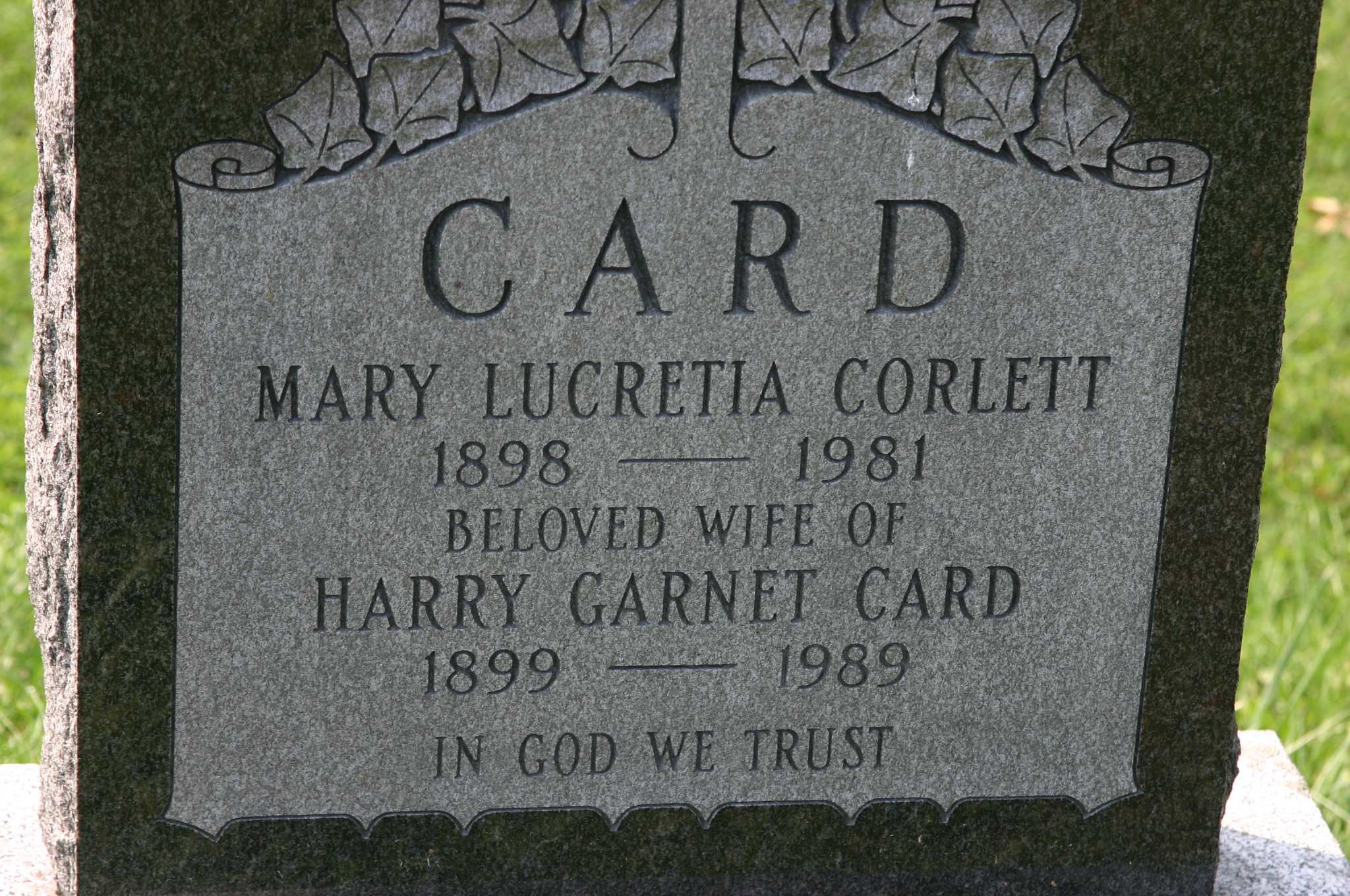 Date Nov 22 1924 from page 24 of "Ours To Remember" by Mary Ann Down, given to me by Shirley (Goodfellow) Bird, Sep. 3, 2004.1,7 Mary Lucretia Corlett lived on 24 December 1927 at Toronto, York Co., Ontario; Witness at marriage of Lawrence Finney & Ada L. Corlett.2 She was buried in 1981 at Mount Hope Cemetery, Brighton, Northumberland Co., Ontario; Memorial: (See Exhibit) CARD; Mary Lucretia Corlett; 1898 - 1981; Beloved Wife of; Harry Garnet Card; 1899 - 1989 (Mount Hope Cemetery, Brighton, Susan Brose CDs, 1 - Oct 3 2005.)6 She died in 1981; Date 1981 per Memorial.6