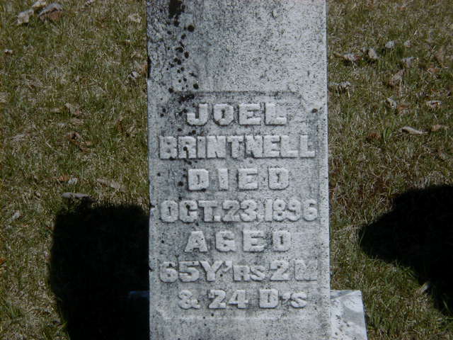 Joel Brintnell lived on 14 January 1892 at Conc 9 Lot 27, Cramahe Twp., Northumberland Co., Canada West; Land Registry Records (Grant 5324) show that Joel Brintnell & wife granted "north half", lot 27, concession 9, Cramahe Twp., Northumberland Co. to Henry E. Crandell for $2,100. ITS Date: Jan 14 1892. Reg'n. Date: Jan 28 1892. (Ontario Land Registry Records, Northumberland Co., Cramahe Twp., Conc 9, pg. 134 of 225, OnLand.ca.)6 He died on 23 October 1896 at Cramahe Twp., Colborne, Northumberland Co., Ontario, at age 65; per GEDCOM of Katie Sweet, May 8, 2005.2 He was buried on 25 October 1896 at Castleton Cemetery, Castleton, Northumberland Co., Ontario; Memorial: (See Exhibit) Joel; Brintnell; Died; Oct 23, 1896; Aged; 65 Y'rs 2 M; & 24 D's (Castleton Cemetery, Castleton, Apr 28, 2007)