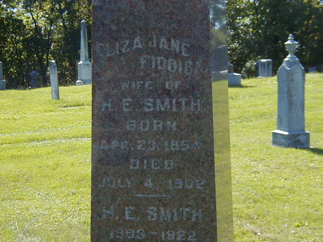 "Eliza Fiddick married Herb Smith. They lived on the third concession south of the Hilton road (often called the telephone road) across from where Clarence Herrington now lives. They later moved to Presqu'ile and kept the lighthouse. Their homes was close by it. They had two daughters; Ethel and Mabel." from page 57 of "Ours To Remember", by Mary Ann Down, given to me by Shirley (Goodfellow) Bird, Sept. 3, 2004.8,9 Eliza Jane Fiddick appeared on the census of April 1881 at Brighton Twp., Northumberland Co., Ontario; Age 27 at 1881 Census: see Herbert E. Smith.3 She appeared on the census of April 1891 at Brighton Twp., Northumberland Co., Ontario; Age 37 at 1891 Census: see Herbert E. Smith.7 She appeared on the census of April 1901 at Brighton Twp., Northumberland Co., Ontario; Age 47 at 1901 Census: see Herbert E. Smith.6 She died on 4 July 1902 at Ontario at age 48; Date Jul 4 1902 per Burial.2 She was buried on 6 July 1902 at Mount Hope Cemetery, Brighton, Northumberland Co., Ontario; Memorial: (See Exhibit) Eliza Jane; Fiddick; Wife of; H. E. Smith; Born; Apr 23 1854; Died; July 4, 1902; H. E. Smith; 1853 - 1922 (Mount Hope Cemetery, Brighton, Sep 26 2004.)2