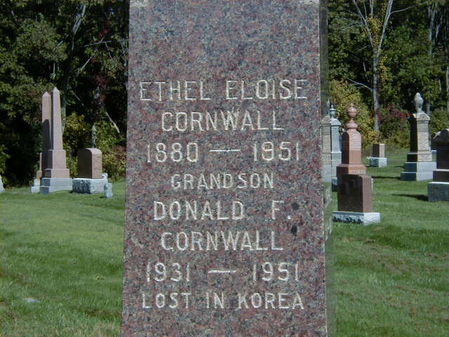 "Ethel Smith married Fred Cornwall. At first they lived near Hilton on the Herb Smith farm on the telephone road. They had five childre; Edna, Frank, Mable, Erma, and Elva. They moved to Presqu'ile also and kept the lighthouse, later they moved to Rochester to live. Fred Cornwall is dead and also his wife." from page 57 of "Ours To Remember", by Mary Ann Down, given to me by Shirley (Goodfellow) Bird, Sept. 3, 2004.1,8 Ethel Louise "Eloise" Smith appeared on the census of April 1901 at Brighton Twp., Northumberland Co., Ontario; Age 20 at 1901 Census: see Frederick T. Cornwall.6 She appeared on the census of 1911 at Brighton Twp., Northumberland Co., Ontario; Age 30 at 1911 Census: see Fred Cornwall.7 She appeared on the census of 16 June 1921 at Ward 1, Brighton, Northumberland Co., Ontario; Age 40 at 1921 Census: see Frederick Cornwall.9 She lived on 10 November 1922 at Village Lot 15, Main St. North, Brighton, Northumberland Co., Ontario; Land Records (Grant 5781) show that Fred T. Cornwall sold "said "lot" part of Village Lot 15, Main Street North Side, Village of Brighton, Northumberland Co. to Ethel E. Cornwall for $1. ITS Date: Nov 10 1922. Reg. Date: Nov 11 1922. (Land Registry Records, Northumberland Co., Brighton Village, Book 004, pg. 331 of 399, page copied from OnLand.ca by Dan Buchanan, Apr 13 2023.)10 She lived on 1 March 1927 at Village Lot 15, Main St. North, Brighton, Northumberland Co., Ontario; Land Records (Grant 6197) show that Ethel E. Cornwall (widow) sold "said "lot" part of Village Lot 15, Main Street North Side, Village of Brighton, Northumberland Co. to Morley R. Simpson for $2,400. ITS Date: Mar 1 1927. Reg. Date: Mar 2 1927. (Land Registry Records, Northumberland Co., Brighton Village, Book 004, pg. 331 of 399, page copied from OnLand.ca by Dan Buchanan, Apr 13 2023.)10 She lived circa 1940 at Rochester, New York, U.S.A; " .. they moved to Rochester to live." from page 57 of "Ours To Remember", by Mary Ann Down, given to me by Shirley (Goodfellow) Bird, Sept. 3, 2004.1 She was buried in 1951 at Mount Hope Cemetery, Brighton, Northumberland Co., Ontario; Memorial: (See Exhibit) Ethel Eloise; Cornwall; 1880 - 1951; Grandson; Donald F; Cornwall; 1931 - 1951; Lost in Korea (Mount Hope Cemetery, Brighton, Sep 26 2004.)2 She died in 1951 at Ontario; Date 1951 per Burial. from page 57 of "Ours To Remember", by Mary Ann Down, given to me by Shirley (Goodfellow) Bird, Sept. 3, 2004.1,2