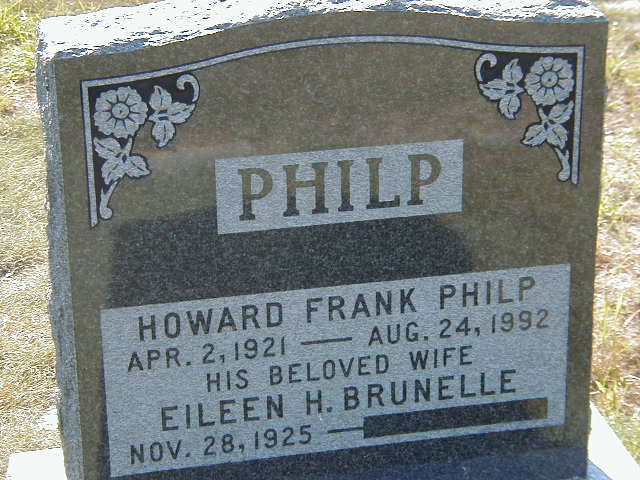 CEMSearch: Name: Howard Frank Philp; Born: 1921-04-02; Died: 1992-08-24; Notes: Died Ajax, ON, husband of Eileen H. Brunelle; Buried: Welcome United Cemetery, Port Hope, Sec B2 Row 03 Plot 280; Other names: Eileen H. Philp (Brunelle) (1925-.2,3 )