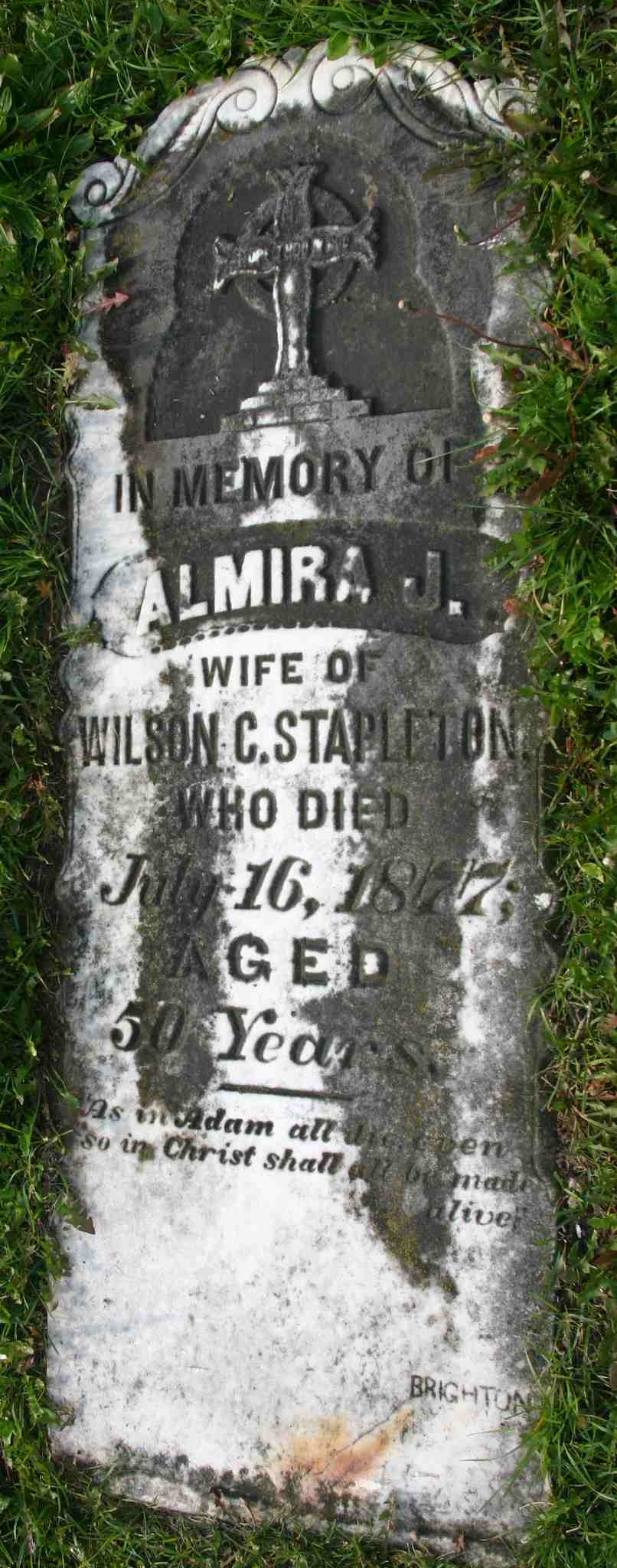 CemSearch: Name: Almira J. Stapleton; Born: - ; Died: Jul 16 1877; Age: 50y; ID: MTHOPE29; No other names; Cemetery: Mount Hope Cemetery, Conc A, Lot 35, Brighton Twp., Brighton Village, Northumberland Co., SEC 1 Row 3; Note: Wife of C. Stapleton (https://www.cemsearch.ca/burial/?pid=MTHOPE29%5E0.)4,5