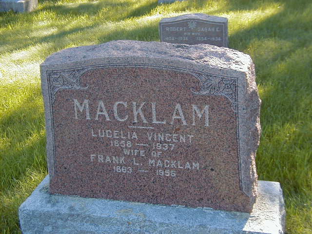 Lucelia M. "Celia" Vincent was born on 7 July 1858 at Brighton, Northumberland Co., Canada West; Date 1858 per Memorial. Date Jul 1860 & location Ont. per 1911 Census. Date Jul 7 1859 & location Ont. per 1901 Census. Date 1861 & location Ont. per 1891 Census. Date 1860 & location Ont. per 1881 Census. Date 1859 & location Ont. per 1871 Census. Date 1859 & location UC per 1861 Census. Date 1857 & location Brighton per marriage reg'n. - Frank Leslie Macklam.1,2,4,5,6,7,8,3 She appeared on the census of April 1861 at Brighton, Northumberland Co., Canada West; Age 2? at 1861 Census: see Stephen Vincent.1 She appeared on the census of April 1871 at Brighton Twp., Northumberland Co., Ontario; Age 12 at 1871 Census: see Stephen Vincent.4 She appeared on the census of April 1881 at Brighton Twp., Northumberland Co., Ontario; Age 21 at 1881 Census: see Stephen Vincent.2 She lived on 15 January 1884 at Brighton, Northumberland Co., Ontario; Witness at marriage of Alva W. Metcalf & Sophia Ann Macklam.3 She lived on 16 June 1886 at Brighton, Northumberland Co., Ontario; Residence Brighton per marriage reg'n. - Frank Leslie Macklam.3 As of 16 June 1886,her married name was Macklam.9 She married Frank Leslie Macklam, son of Thomas Macklam and Elizabeth Hill Mullett, on 16 June 1886 at Brighton Twp., Northumberland Co., Ontario; Marriage Reg'n.#008479: Groom: Frank Leslie Macklam; Age: 23; Res. & Born: Brighton Twp; Status: bachelor; Occ.: farmer; Parents: Thomas Macklam & Elizabeth Mullett?; Bride: Cecelia M. Vincent; Age: 26; Res. & Born: Brighton; Status: spinster; Parents: Stephen Vincent & Mary Scott; Wit.: John & Sarah Vincent, Brighton; Date: Jun 16 1886; Place: Brighton; Rel.: Meth; Performed by: T. Meyers?; Reg'r.: M. K. Lockwood (Ontario Marriage Registration, #008479-1886, ancestry.com.)9 Lucelia M. "Celia" Vincent appeared on the census of April 1891 at Brighton Twp., Northumberland Co., Ontario; Age 30 at 1891 Census: see Thomas Macklam (father-in-law.)8 She appeared on the census of April 1901 at Brighton Twp., Northumberland Co., Ontario; Age 42 at 1901 Census: see Frank L. Macklam.6 She appeared on the census of 5 June 1911 at 65 St. Patrick St., Toronto Centre, York Co., Ontario; Age 50 at 1911 Census: see Frank L. Macklam.7 She died on 24 September 1937 at Ontario at age 79; Date 1937 per Memorial. ""Macklam, Catherine Lucelia Vincent; Died September 24, 1937; October 1, 1937" from index of Brighton Ensign, Trenton Public Library, Dec 21 2013.5,10 She was buried on 26 September 1937 at Wood's Cemetery, Cramahe Twp., Northumberland Co., Ontario; Memorial: (See Exhibit) MACKLAM; Lucelia Vincent; 1858 - 1937; Wife of; Frank L. Macklam; 1863 - 1956 (Wood's Cemetery, Cramahe Twp., Jul 3 2004.)5