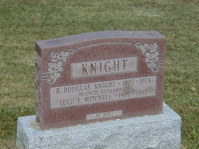 Date March 20 1907 per 1911 Census. from page 70 of "Ours To Remember" by Mary Ann Down, given to me by Shirley (Goodfellow) Bird Sep. 3, 2004.1,3,4 She appeared on the census of 1911 at Percy Twp., Norham, Northumberland Co., Ontario; Age 4 at 1911 Census: see Robert I. Mitchell.3 As of 5 September 1928,her married name was Knight.1 She married Richard Douglas Knight, son of Richard T. Knight and Edna Maria Clark, on 5 September 1928 at Norham, Northumberland Co., Ontario; "Lulu married Douglas Knight and they lived in her parents' home near Norham." from page 70 & 71 of "Ours To Remember" by Mary Ann Down, given to me by Shirley (Goodfellow) Bird Sep. 3, 2004.1 Lulu Ethel Mitchell was buried in 1997 at Stone's Cemetery, Percy Twp., Northumberland Co., Ontario; Memorial: (See Exhibit) Knight; R. Douglas Knight 1907 - 1974; Beloved Husband of; Lulu E. Mitchell 1907 - 1997 (Stone's Cemetery, Norham, Percy Twp.)5 She died in 1997 at Ontario; Date 1997 per Memorial.5