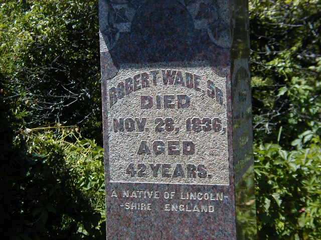 CemSearch: Name: Robert Wade, Sr; Born: 1794; Died: Nov 28 1836; Age: 42; ID: WAITE072; Other names: Rawson, Oliver Hannibal (1804-1866), Wade, Hannah [Rawson] (1803-1893, Wade, Robert Jr. (1828-1866); Cemetery: Waite Cemetery, Conc 4, Lot 11, Cramahe Twp., Northumberland Co., Sec B-E Row 2 Plot 10; Note: Husband of Hanna Rawson, Father of Robert Jr., & William Wade, a native of Lincolnshire England (https://www.cemsearch.ca/burial/?pID=WAITE072%5E0.)4,3