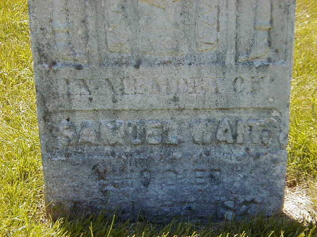 Note: Memorial is unclear but CEMSearch record is definite. Email from Blair Waite (May 14 2010) informed me of wrong info re a late marriage for another Samuel Wait in 1873. Hope this is correct now.1,2,9,10