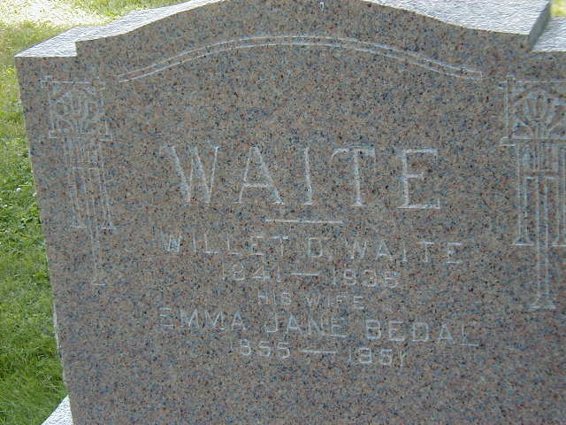 Emma Jane Bedal was born on 15 June 1855 at Brighton Twp., Northumberland Co., Canada West; Date 1855 per Burial. Date Jun 16 1855 & location Ont. per Death Reg'n. Date June 16 1855 & location Ont. rural per 1901 Census. Date June 1855 & location Ont. per 1911 Census. Date 1855 & location Northumberland Co. per 1861 Census. Date 1855 & location Brighton Twp. per marriage reg'n. - Jane Bedal. Date Jun 15 1858 per GEDCOM of Keith Armstrong, Oct. 28, 2004.1,7,8,2,3,4,5 She appeared on the census of April 1861 at Brighton Twp., Northumberland Co., Canada West; Age 6 at 1861 Census: see Isaac J. Bedal.3 She lived on 2 October 1873 at Brighton Twp., Northumberland Co., Ontario; Residence Brighton Twp. per marriage reg'n. - Willet C. Waite.4 As of 2 October 1873,her married name was Waite.1 She married Willet Casey Waite, son of Griffin Wait and Elizabeth B. Sprung, on 2 October 1873 at Colborne, Northumberland Co., Ontario; Marriage Reg'n.#001448: Groom: Willett Waite; Age: 31; Res. & Born: Cramahe Twp; Status: bachelor; Occ.: farmer; Parents: Griffin & Betsey Waite; Bride: Jane Bedel; Age: 18; Res. & Born: Brighton Twp; Status: spinster; Parents: Isaac & Matura Bedal; Wit.: Ann Miller & Minerva Mill, Colborne; Date: Oct 2 1873; Place: Colborne; Rel.: Meth; Performed by: George Miller, Colborne, Northumberland Co. (Ontario Marriage Registration, #001448-1873, ancestry.ca) Date Nov 26 1872 per GEDCOM of Keith Armstrong, Oct. 28, 2004.1,9 Emma Jane Bedal appeared on the census of April 1881 at Cramahe Twp., Northumberland Co., Ontario; Age 26 at 1881 Census: see Willet C. Waite.10 She appeared on the census of April 1901 at Brighton Twp., Northumberland Co., Ontario; Age 46 at 1901 Census: see Willet C. Waite.7 She appeared on the census of June 1911 at Brighton Twp., Northumberland Co., Ontario; Age 56 at 1911 Census: see Willet C. Waite.8 She appeared on the census of 9 June 1921 at Brighton Twp., Northumberland Co., Ontario; Age 62 at 1921 Census: see Willet C. Waite.6 She died on 5 November 1951 at Russell St., Brighton, Northumberland Co., Ontario, at age 96; Death Reg'n.#036922: Name: Emma Jane Waite; Date: Nov 5 1951; Age: 96y 4m 19d; Res.: Russell St., Brighton; Born: Ont. June 16 1855; Nat.: Eng; Status: widow; Spouse: Willet Waite; Parents: Isaac Bedal & Matilda Tubbs, both b. Ont; Burial: Mount Hope Cemetery, Brighton, Nov ? 1951; Inf.: Roswell Blake Waite, 672 KIign George Highway, New Westminster, British Columbia; Burial Permit: Nov 6 1941, G.H. Thomas, Brighton; Funeral Dir.: H.K. Cumming, Brighton; Reg'd.: Nov 6 1941; Reg'r.: G. H. Thomas, Brighton, Northumberland Co. (Ontario Death Registration, #036922-1951, ancestry.ca)