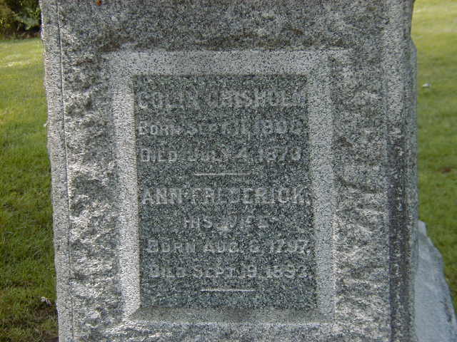 Colin Chisholm was born on 11 September 1800 at Thurlow Twp., Hastings Co., Upper Canada; Date Sep 11 1800 per Memorial. Date Sep 11 1800 per CEMSearch Record. Date 1801 per 1871 Census. Date 1796 per per IGI Record.1,4,5,6 He married Anne Frederick, daughter of John Frederick and Mary Bush, before 1823 at Hastings Co., Upper Canada; "Colon Chisholm, m. ann Frederick; set Thurlow. Issue: (1) Alexander S., (2) Emily J., (3) James F., (4) Harvey F., (5) Mary F., (5) Eliza E." per pg. 238, Pioneer Life on the Bay of Quinte.7 Colin Chisholm lived on 29 March 1829 at Conc 2 Lot 18, Thurlow Twp., Hastings Co., Upper Canada; Land Registry Records (Will D2594) show that Colin Chisholm obtained the West Half and John Chisholm obtained the East Half of Lot 18, Conc 2, Thurlow from Alexander Chisholm, ITS Date: Mar 29, 1829, Reg'd.: Nov 13, 1834.8 He lived in 1851 at Conc 2 Lot 18, Thurlow Twp., Hastings Co., Canada West; Residence per 1851 Census: Conc 2, Lot 18, 200 acres, owner.2 He appeared on the census of 1852 at Thurlow Twp., Hastings Co., Canada West; Age 52 at 1851 Census: Chisholm, Colin, 52, b. Cda., WM, farmer, married; Ann, 53, b. Cda., WM, married; Alex S., 27, single; James F., 22; Mary, 18; Eliza, 15.2 He appeared on the census of April 1861 at Thurlow Twp., Hastings Co., Canada West; Age 60 at 1861 Census: Chisholm, Colin, 60, b. UC, WM, farmer, married; Ann, 62, b. UC, WM, married; James, 30; Mary, 25; Eliza, 21.9 He appeared on the census of April 1871 at Thurlow Twp., Hastings Co., Ontario; Age 70 at 1871 Census: Chisholm, Collen, 70, b. Ont., WM, Scot., farmer, married; Ann, 72, b. Ont., WM, Scot., married; James, 42, b. Ont., WM, Scot., farmer, married; Margaret, 32, b. Irel., WM, irish, married; Frederick, 2, b. Ont., WM, Scot; William, 1 (Conc 2, Lot 18, 100 acres, owner.)4 He lived in April 1871 at Conc 2 Lot 18, Thurlow Twp., Hastings Co., Ontario; Residence per 1871 Census: Conc. 2, Lot 18, 100 acres, owner.4 He died on 14 July 1873 at Thurlow Twp., Hastings Co., Ontario, at age 72; Date Jul 14 1873 per Memorial. Date July 14 1873 per CEMSearch Record. Date 1873 per email from Andrew Way, Jan 9, 2006. Date 1893 per IGI Record. Died Thurlow per IGI Record.1,10,5,6 He was buried on 16 July 1873 at Belleville Cemetery, Belleville, Hastings Co., Ontario; Memorial: (See Exhibit) Colin Chisholm; Born Sep 11 1800; Died July 14 1873; Ann Frderick; His Wife; Born Aug 6 1797; Died Sept. 9 1893 (Belleville Cemetery, Belleville, June 22, 2006)