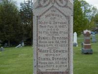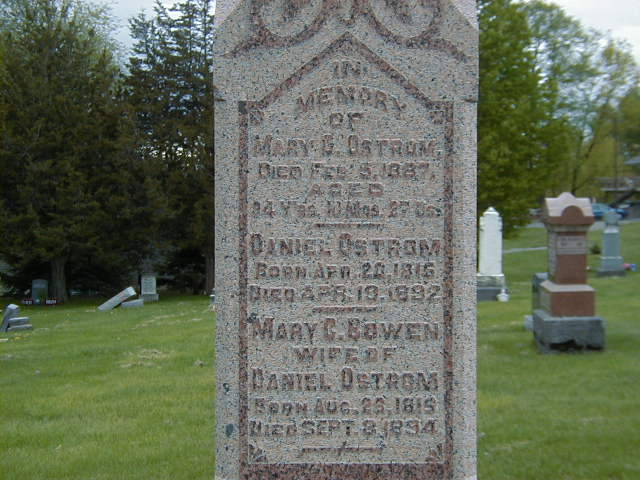 Note: Who is Charlott McNalley??3 He appeared on the census of April 1881 at Sidney Twp., Hastings Co., Ontario; Age 65 at 1881 Census: Ostrom, Daniel, 65, b. Ont., Dutch, Pres., Butcher, married; Mary C., 62, b. Ont., Dutch, pres., married; Mary C., 26, b. Ont; Charlotte I., 24; Byron B., 22, b. Ont., Druggist; Mary M., 6, b. USA, Dutch, C. Pres. (familysearch.org.)4 He died on 19 April 1892 at Sidney Twp., Frankford, Hastings Co., Ontario, at age 75; per IGI Record.1 He was buried on 21 April 1892 at Frankford Cemetery, Frankford, Hastings Co., Ontario; Memorial: (See Exhibit) In Memory of; Mary G.Ostrom; Died Feb 5 1887; Aged; 34 yrs, 10 Mos & 7 Dys; Daniel Ostrom; Born Apr 20 1816; Died Apr 19 1892; Mary C. Bowen; Wife of; Daniel Ostrom; Born aug 26 1819; Died Sept 8 1894 (Frankford Cemetery, May 22, 2005.)2