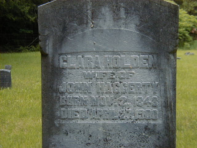 Clarissa "Clara" Holden was born on 2 November 1848; Date Nov 2 1848 per Memorial. Date Nov 2 1848 per GEDCOM of Arnold V. Weirmeir, Dec 11, 2004.1,2 As of circa 1869,her married name was Haggerty.1 She married John Chisholm Haggerty, son of Adam Haggerty and Elenor "Ellen" Chisholm, circa 1869 at Hastings Co., Ontario; per GEDCOM of Arnold B. Weirmeir, March 23, 2005.1 Clarissa "Clara" Holden died on 27 April 1900 at Ontario at age 51; Date Apr 27 1900 per Memorial.2 She was buried on 29 April 1900 at Gunter Cemetery, Gunter, Hastings Co., Ontario; Memorial: (See Exhibit) Clara Holden; Wife of; John Haggerty; Born Nov. 2 1848; Died Apr 27 1900 (Gunter Cemetery, Gunter, June 23, 2006.)2
