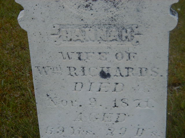 Hannah Day was born on 11 October 1802 at England; Date Oct 11 1802 per age calc from Burial. Date Oct 11 1802 per GEDCOM of Steve Oler, Dec. 18, 2004.1,2 She married William Richards before 1823 at England; per GEDCOM of Steve Oler, Dec. 18, 2004.1 As of before 1823,her married name was Richards.1 Hannah Day appeared on the census of April 1861 at Murray Twp., Northumberland Co., Ontario; Age 55 at 1861 census: see William Richards.3 She died on 9 November 1871 at Murray Twp., Northumberland Co., Ontario, at age 69; Date Nov 9 1871 per Burial. Date Nov 9 1871 per GEDCOM of Steve Oler, Dec. 18, 2004.1,2 She was buried on 11 November 1871 at Stockdale Cemetery, Stockdale, Northumberland Co., Ontario; Memorial: (See Exhibit) Hannah; Wife of; Wm. Richards; Died; Nov. 9, 1871; Aged; 69 Y's & 29 D's (Stockdale Cemetery, May 26, 2006)