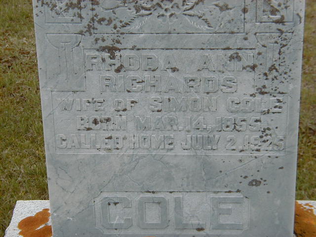 per GEDCOM of Steve Oler, Dec. 18, 2004.1,2,3,4,5,6,7,8,9 She appeared on the census of April 1861 at Murray Twp., Northumberland Co., Ontario; Age 5 at 1861 Census: see John Richards.7 She appeared on the census of April 1871 at Murray Twp., Northumberland Co., Ontario; Age 16 at 1871 Census: see John Richards.10 As of 1 December 1875,her married name was Cole.1 She married Simon Cole, son of John Cole and Lydia Whitney, on 1 December 1875 at Sidney Twp., Frankford, Hastings Co., Ontario; Marriage Reg'n.#003387: Groom: Simon Cole; Age: 28; Res.: Murray; Born: Brighton; Status: bachelor; Occ.: farmer; Parents: John & Lydia Cole; Bride: Rhoda Ann Richards; AgE: 20; Res.: Murray; Born: Fredericksburgh; Status: spinster; Parents: John & Margaret Richards; Wit.: Gilbert & Hester Marsh?, Frankford; Date: Dec 1 1875; Place: Frankford; Rel.: EM; Performed by: B.? W. Marsh?; Reg'r.: F. B. Prior (Ontario Marriage Registration, #003387-1875, ancestry.com)