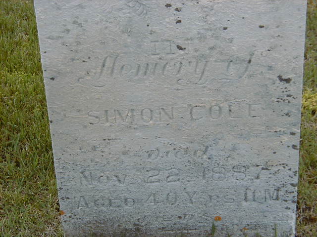 per GEDCOM of Steve Oler, Dec. 18, 2004.1,3,12,9 He was buried on 5 December 1887 at Stockdale Cemetery, Murray Twp., Northumberland Co., Ontario; Memorial: (See Exhibit) In; Memory of; Simon Cole; Died; Nov. 22, 1887; Aged 40 Yrs 11 Mo. (Stockdale Cemetery, Murray Twp., May 21 2005)