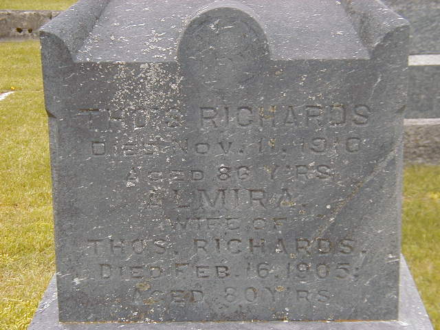 (1871 Census Index Online: Div. 3, pg. 9, C-9985.)5 He lived in 1878 at Conc 7 Lot 18, Murray Twp., Northumberland Co., Ontario; County Atlas: Name: Thomas Richards; Township: Murray; County: Northumberland: Nativity: England; Occ.: farmer; Settled: 1837; Date: 1878; Conc & Lot: Vii, 18 - 60 acres.3 He appeared on the census of April 1881 at Murray Twp., Northumberland Co., Ontario; Age 56 at 1881 Census: Richards, Thomas, 56, b. England, Eng., EM, farmer, married; Almira, 56, b. Ont., American, EM, married; Willet, 19, b. Ont., Eng., EM, farmer son; Susan, 16; Thomas B., 13; Sharpe, Marretta, 21, b. Ont., Eng., EM, married (familysearch.org.)6 He appeared on the census of 5 May 1882 at Murray Twp., Northumberland Co., Ontario; Informant for Death Reg'n. of his father William Richards.7 He appeared on the census of April 1901 at Sophiasburgh Twp., Prince Edward Co., Ontario; Age 76 at 1901 Census: Richards, Thomas, 76, b. England Mar 12 1825, Eng., Meth., farmer, married; Almyra, 76, b. Ont. r. Jan 3 1825, Eng., Meth., married; Willet B., 39, b. Ont. r. Jan 28 1862, Eng., Meth., son, married; Margaret, 43, b. Ont. r. Sep 12 1857, Irish, Meth., daughter-in-law, married; Thomas B., 9, b. Jan 11 1892, Eng., son; Annie M., 5, b. Dec 11 1895, daughter (1901 Census Online: Sophiasburgh Twp., Prince Edward Co., dist. 109, sub-dist. h-3, pg. 6, line 1, T-6493 - s. pt. Lot 46, 47, 1C, WJP.)2 He died on 11 November 1910 at Sophiasbugh Twp., Prince Edward Co., Ontario, at age 86; Date Nov 11 1910 per Buria. Sophiasburgh per 1901 Census. Murray per IGI Record. Date Nov 11 1910 & Location Sophiasburgh per "Descendants of William Richards" sent to me via email by Linda Smith, Jan. 5, 2004.1,8,2,9 He was buried on 13 November 1910 at Stockdale Cemetery, Stockdale, Northumberland Co., Ontario; Memorial: (See Exhibit) Thos. Richards; Died Nov. 11 1910; Aged 86 Years; Almira; Wife of; Thos. Richards; Died Feb 16, 1905; Aged 80 Years (Stockdale Cemetery, May 26, 2006)