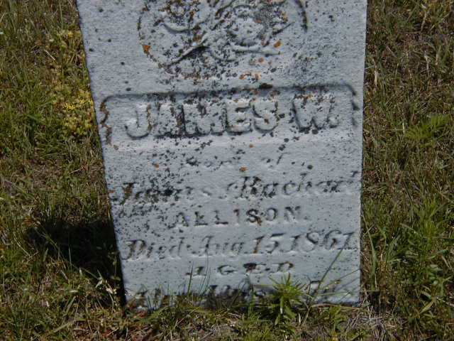 James W. Allison was born in 1860 at Brighton Twp., Northumberland Co., Canada West; Date 1860 per 1861 Census.1 He appeared on the census of April 1861 at Brighton Twp., Northumberland Co., Canada West; Age 1 at 1861 Census: see James Allison.1 He died on 15 August 1861 at Ameliasburgh Twp., Prince Edward Co., Ontario; Date Aug 15 1861 per Memorial.2 He was buried on 17 August 1861 at Albury Cemetery, Ameliasburgh Twp., Albury, Prince Edward Co., Ontario; Memorial: (See Exhibit) James W; Son of; James & Rachel; Allison; Died Aug 15, 1861; Aged.... (Albury Cemetery, Ameliasburgh Twp., Jul 11 2004.)2