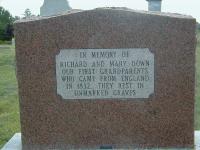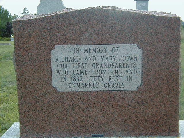 Richard Down was born circa 1780 at England; Date of birth and death unknown per Memorial. per GEDCOM of C. Penasack, Jan 17, 2005.1,2 He married Mary Elizabeth Hewitt before 1810 at England; per GEDCOM of C. Penasack, Jan 17, 2005.1 Richard Down immigrated in 1832 to Ontario; Immigration 1832 per Memorial.2 He was buried in 1847 at Brighton Twp., Northumberland Co., Canada West; Memorial: (See Exhibit) In Memory of; Richard and Mary Down; Our First Grandparents; Who Came From England; in 1832. They Rest; In Unmarked Graves (McPhail's Cemetery, Brighton Twp., Aug 25 2006)