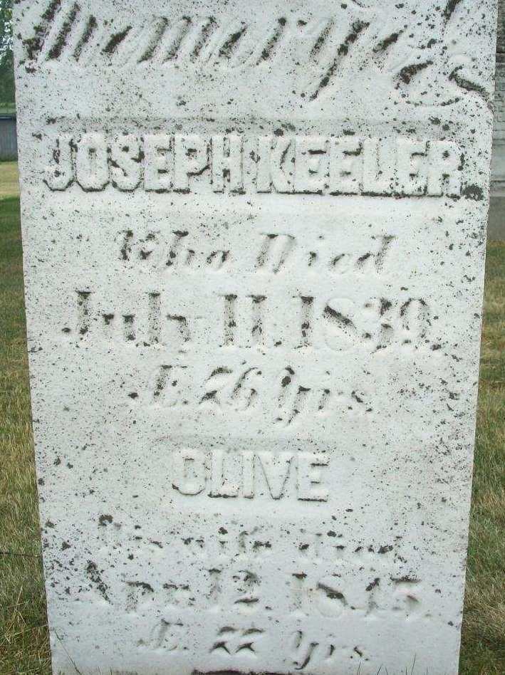 per GEDCOM of Elizabeth Lewis, Jan 20, 2005.1,3 He was buried on 13 July 1839 at Lakeport Cemetery, Haldimand Twp., Lakeport, Northumberland Co., Upper Canada; Memorial: (see Exhibit) In Memory of; Joseph Keeler; Who Died; July 11, 1839; AE 76 Yrs; Olive; His Wife died; Apr 12, 1845; AE 77 Yrs. (Lakeport Cemetery, Lakeport, image by Dan, May 29 2012.) Date Jul 11 1839 & location Lakeport per GEDCOM of Roxanne Muns, Jan 25, 2005.1,3