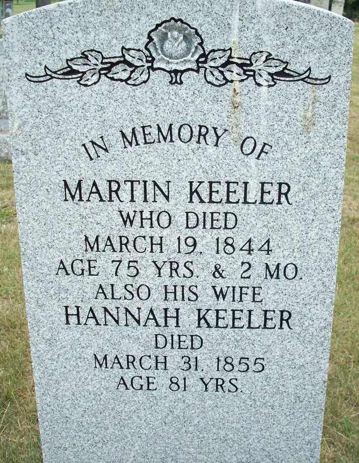 Martin Keeler was born on 19 January 1769 at Lanesborough, Berkshire Co., Massachusetts, U.S.A; Date Jan 1769 per Memorial - age 75y 2m at death Mar 19 1844. Daet Jan 19 1769 & locaiton Lanesborough, Berskhire Co., Mass. per GEDCOM of Elizabeth Lewis, Jan 20, 2005.1,2 He married Hannah Waite before 1790; per GEDCOM of Elizabeth Lewis, Jan 20, 2005.1 Martin Keeler died on 19 March 1844 at Haldimand Twp., Lakeport, Northumberland Co., Canada West, at age 75; Date Mar 19 1844 per Memorial. Date Mar 19 1844 & location Lakeport per GEDCOM of Elizabeth Lewis, Jan 20, 2005.1,2 He was buried on 21 March 1844 at Lakeport Cemetery, Haldimand Twp., Lakeport, Northumberland Co., Canada West; Memorial: (see Exhibit) In Memory of; Martin Keeler; Who Died; March 19, 1844; Aged 75 Yrs. & 2 Mo; Also His Wife; Hannah Keeler; Died; March 31, 1855; Age 81 Yrs. (Lakeport Cemetery, Lakeport, image by Dan, May 29 2012.)2