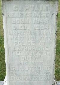 Henry Samuel Casey was born on 23 July 1848 at Cramahe Twp., Northumberland Co., Canada West; Date 1848 per Memorial. Date 1849 & location Ont. per 1871 Census. Date 1847 & location Cda. per 1851 Census. Date 1848 & location Cramahe Twp. per marriage reg'n. - Caroline M. Storng. Date Jul 23 1848 & location Colborne per family tree of Maree Winchester on ancestry.ca, Oct 23 2021. per GEDCOM of Roxanne Muns, Jan 25, 2005.1,3,2,4,5,6 He appeared on the census of 1852 at Cramahe Twp., Northumberland Co., Canada West; Age 4 at 1851 Census: see Horation Nelson Casey.3 He appeared on the census of April 1871 at Colborne, Northumberland Co., Ontario; Age 22 at 1871 Census: see Horation Nelson Casey.5 He lived on 1 September 1875 at Colborne, Northumberland Co., Ontario; Residence Colborne per marriage reg'n. - Caroline M. Strong.2 He married Caroline M. "Carry" Strong, daughter of James Stewart Strong and Maria Ewing Powers, on 1 September 1875 at Colborne, Northumberland Co., Ontario; Marriage Reg'n.#006414: Groom: Henry S. Casey; Age: 27; Res.: Colborne; Born: Cramahe Twp; Status: bachelor; Occ.: Merchant; Parents: H.N. & Eliza Casey; Bride: Carrie M. Strong; Age: 22; Res. & Born: Cramahe Twp; Status: spinster; Parents: Stewart & Maria Strong; Wit.: George W. Casey, Colborne & ?Jessie? Strong, Castleton; Date: Sep 1 1875; Place: Trinity Church, Colborne; Rel.: CE; Performed by: H. D. Cooper; Reg'r.: A. Vars, Colborne (Ontario Marriage Registration, #006414-1875, ancestry.ca.)7 Henry Samuel Casey died on 26 March 1904 at Butte, Silver Bow Co., Montana, U.S.A., at age 55; Date 1904 per Memorial. Date Mar 26 1904 & location Butte, Silver Bow Co., Montana per family tree of Maree Winchester on ancestry.ca, Oct 23 2021.4,6 He was buried on 30 March 1904 at Lakeport Cemetery, Haldimand Twp., Lakeport, Northumberland Co., Ontario; Memorial: (see Exhibit) Captain; Henry S. Casey; Born: 1848; Died: 1904; Inspector North; West Mounted; Police at; Lethbridge; Died While On; Duty; His Wife; C. M. Strong; Born: June 12, 1853; Died May 27 1924 (Lakeport Cemetery, Haldimand Twp., May 29 2012, by Dan.)6