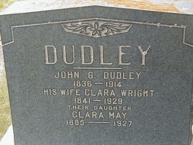 Christianna C. "Clara" Wright was born on 22 August 1844 at Ontario; Date Aug 22 1844 per GEDCOM of Don & Jeanne Ross, Jan 27, 2005. Date 1841 per Burial.1,2 As of 30 May 1859,her married name was Dudley.1 She married John Guilford Dudley, son of John Dudley and Elizabeth "Polly" Simmons, on 30 May 1859 at Ontario; per GEDCOM of Don & Jeanne Ross, Jan 27, 2005.1 Christianna C. "Clara" Wright was buried in 1929 at Union Cemetery, Colborne, Northumberland Co., Ontario; Memorial: (See Exhibit) DUDLEY; John G. Dudley; 1836 - 1914; His wife Clara Wright; 1841 - 1929; Their Daughter; Clara May; 1885 - 1927 (Union Cemetery, Colborne, May 23, 2005)