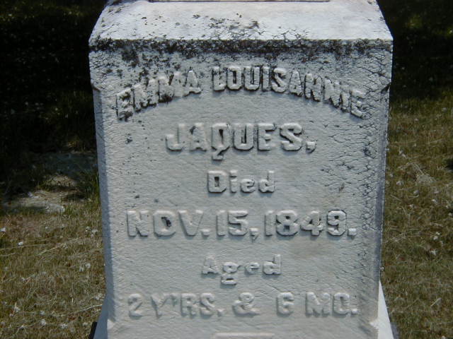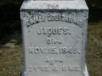 Emma Louisanne Jaques was born in May 1847 at Cramahe Twp., Northumberland Co., Canada West; per GEDCOM of Mary Chung, Apr 1 2005.1 She died on 15 November 1849 at Cramahe Twp., Northumberland Co., Canada West, at age 2; per GEDCOM of Mary Chung, Apr 1 2005.1 She was buried on 17 November 1849 at Salem Cemetery, Cramahe Twp., Salem, Northumberland Co., Canada West; Memorial: (See Exhibit) Emma Louisannie; Jaques; Died; Nov 14, 1849; Aged; 2 Y'rs & 6 Mo's (Salem Cemetery, June 5, 2005)