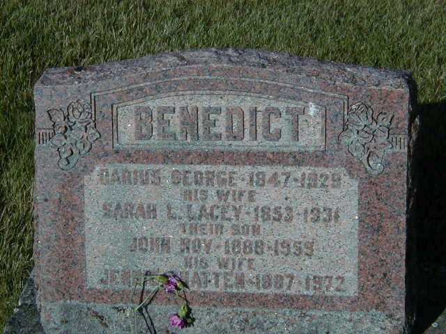 Sarah Louise Lacey was born on 25 December 1853 at Rawden Twp., Hastings Co., Canada West; Date 1853 per Memorial. Date Dec 25 1853 CemSearch. Date 1854 & location "Rodden" (Rawdon Twp.) per marr. reg'n. per GEDCOM of Teresa Smith, April 2, 2005.1,3,2,4 She lived on 30 December 1874 at Cramahe Twp., Northumberland Co., Ontario; Wintess at marriage of Josiah Benedict and Emily Merrill.4 She married Darius George Benedict, son of Daniel D. Benedict and Louisa Hubbell, on 28 November 1879 at Colborne, Northumberland Co., Ontario; Marriage Reg'n.#007351: Groom: Darius Benedict; Age: 32; Res. & Born: Haldimand Twp; Status: bachelor; Occ.: farmer; Parents: Daniel & Louisa Benedict; Bride: Sarah Lacey; Age: 25; Res.: Cramahe Twp; Born: Rodden (Rawdon?); Status: spinster; Parents: John & Louisa Lacey; Wit.: L. H. & Kate Duncan; Date: Nov 28 1879; Place: Colborne; Rel.: Bapt; Peformed by: Peter Marshaneu Duncan, by license; Reg'r.: A. Vail, Colborne (Ontario Marriage Registration, #007351-1879, ancestry.ca) per GEDCOM of Teresa Smith, April 2, 2005.5 Sarah Louise Lacey lived on 28 November 1879 at Cramahe Twp., Northumberland Co., Ontario; Residenc Cramahe Twp. per marr. reg'n.4 As of 28 November 1879,her married name was Benedict.1 She died on 6 March 1931 at Salem Cemetery, Cramahe Twp., Salem, Northumberland Co., Ontario, at age 77; Date 1931 per Memorial. Date Mar 6 1931 per CemSearch.3,2 She was buried on 8 March 1931 at Salem Cemetery, Cramahe Twp., Salem, Northumberland Co., Ontario; Memorial: (See Exhibit) BENEDICT; Darius George - 1847-1929; His Wife; Sarah L. Lacey 1853-1931; Their Son; John Roy 1888-1959; His Wife; Jennie Chatten 1887-1972 (Salem Cemetery, Cramahe Twp., July 10 2004, by Dan)