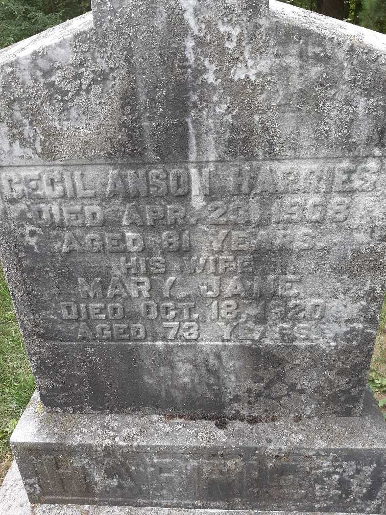 Mary Jane Allard was born on 14 July 1847 at Murray Twp., Weller's Bay, Northumberland Co., Canada West; Date 1847 per Memorial - age 73 at death Oct 18 1920. Date June 1847 & location Weller's Bay per Death Reg'n. Date Jul 14 1847 & location Ont. rural per 1901 Census. Date 1849 & location Ont. per 1891 Census. Date 1846 & location UC per 1861 Census. Date 1845 & location Cda. per 1851 Census. Date Jul 14 1847 & location Weller's Bay, Murray Twp.,Northumberland Co. per family tree of MarchHare2 on ancestry.ca, Feb 5 2022.1,2,3,4,5,6,7 She appeared on the census of 1852 at Murray Twp., Northumberland Co., Canada West; Age 6 at 1851 Census: see Hannah Allard (grandmother.)7 She appeared on the census of April 1861 at Murray Twp., Northumberland Co., Canada West; Age 15 at 1861 Census: see Henry Allard.1 As of circa 1868,her married name was Harries.2 She married Cecil Anson Harries circa 1868 at Ontario; per family tree of MarchHare2 on ancestry.ca, Feb 5 2022.2 Mary Jane Allard appeared on the census of 11 April 1891 at Murray Twp., Northumberland East Co., Ontario; Age 42 at 1891 Census: see Cecil A. Harries.4 She appeared on the census of 12 April 1901 at Murray Twp., Northumberland East Co., Ontario; Age 53 at 1901 Census: see Cecil A. Harries.3 She died on 18 October 1920 at Murray Twp., Carrying Place, Northumberland Co., Ontario, at age 73; Death Reg'n.#027367: Name: Mary Jane Harries; Date: Oct 18 1920; Age: 73y; Res.: Carrying Place, Murray Twp., 20y; Born: Weller's Bay, Murray Twp., June 1847; Nat.: Eng; Status: widow; Parents: Henry Sanford Allard, b. Ont. & Catherine Lawson, b. Pr. Edward Co; Inf.: G. H. Harries, Indianapolis, Indiana, USA, son; Burial: Mount Carmel Cemetery, Oct 20 1920; Und.: N.J. McNair, Trenton; Cause: pernicious anaemia; Phys.: R.J. Wade, Brighton; Reg;d.: Oct 19 1920; Reg'r.: E.M. Wessels, Murray Twp. (Ontario Death Registration, #027367-1920, ancestry.ca) per family tree of MarchHare2 on ancestry.ca, Feb 5 2022.8 She was buried on 20 October 1920 at Mount Carmel Cemetery, Murray Twp., Northumberland Co., Ontario; Memorial: (see Exhibit) Cecil Anson Harries; Died Apr. 23, 1908; Aged 81 Years; His Wife; Mary Jane; Died Oct. 18, 1920; Aged 73 Years (Mount Carmel Cemetery, Murray Twp., image from FindaGrave, Feb 5 2022) Date Oct 20 1920 & location Mount Carmel Cemetery per Death Reg'n.5,6