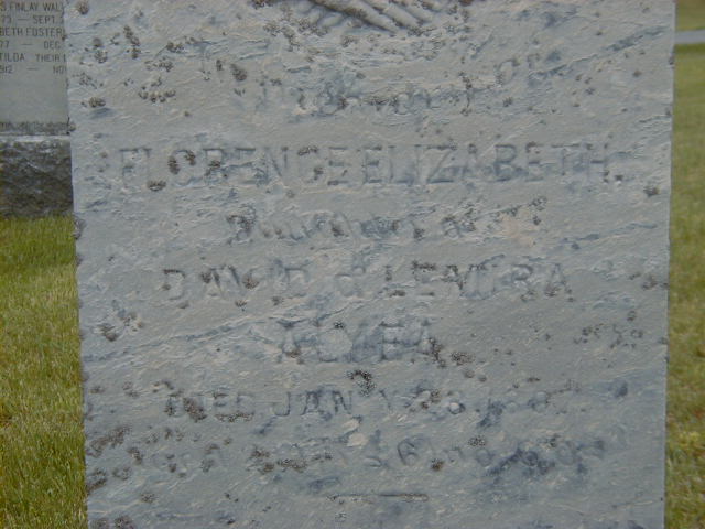 Florence Elizabeth Alyea was born in 1867 at Ontario; Date 1867 per 1881 Census.1 She appeared on the census of April 1881 at Murray Twp., Northumberland Co., Ontario; Age 14 at 1881 Census: see David Alyea.1 She died on 23 January 1887 at Ontario; Date Jan 23 1887 per Burial.2 She was buried on 25 January 1887 at Stockdale Cemetery, Murray Twp., Stockdale, Northumberland Co., Ontario; Memorial: (See Exhibit) In Memory of; Florence Elizabeth; Daugher of; David and Lemira; Alyea; Died Jan'y 23 1887; Aged ?? (Stockdale Cemetery, May 26, 2006.)2
