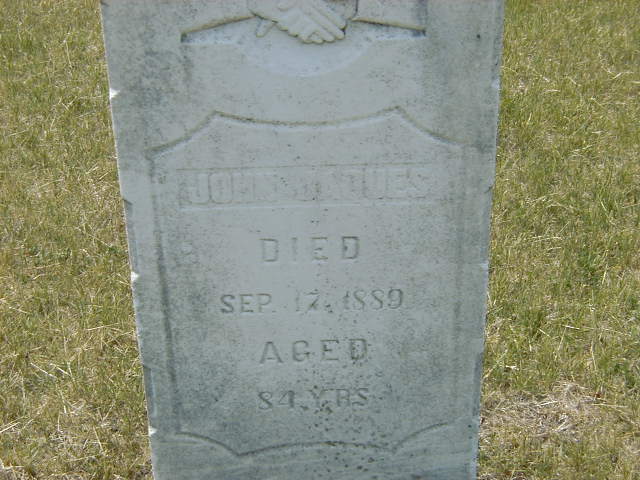 John Jaques was born on 12 February 1805 at Staithes, Yorkshire, England; per GEDCOM of Kimberley Fraser, May 3, 2005.1 He appeared on the census of 1851 at Cramahe Twp., Northumberland Co., Canada West; Age 45 at 1851 Census: Jaques, John, 45, b. England, WM, Shoemaker, single; Mary, 66, b. England, WM, widow; Jane, 22, b. England, single; Ventress, Spencer, 12, b. England, WM; Bellamy, Hannah, 33, b. England, WM, other res. Brock, M?; Jemima, 13, b. Cda., other res. Brock; Chas. W., 2, b. Cda., WM, other res. Brock.2 He died on 17 September 1889 at Cramahe Twp., Salem, Northumberland Co., Ontario, at age 84; Date Sep 17 1889 per Burial. per GEDCOM of Kimberley Fraser, May 3, 2005.1,3 He was buried on 19 September 1889 at Salem Cemetery, Cramahe Twp., Salem, Northumberland Co., Ontario; Memorial: (See Exhibit) John Jaques; Died; Sep 17 1889; Aged; 84 Years (Salem Cemetery, June 5, 2005)