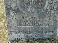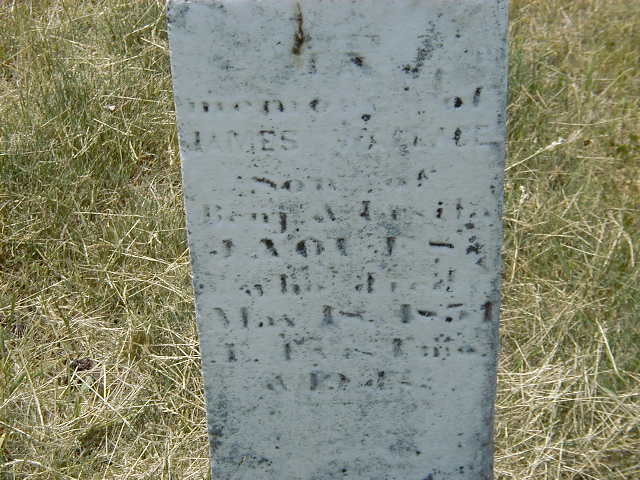 James Wallace Jaques was born on 30 March 1850 at Cramahe Twp., Northumberland Co., Ontario; per GEDCOM of Kimberley Fraser, May 3, 2005.1 He died on 18 May 1854 at Cramahe Twp., Salem, Northumberland Co., Ontario, at age 4; Date May 18 1854 per GEDCOM of Kimberley Fraser, May 3, 2005. Date looks like May 18 1851 per grave stone??? Look at this again?? 1851 Census??1,2 He was buried on 20 May 1854 at Salem Cemetery, Cramahe Twp., Salem, Northumberland Co., Ontario; Memorial: (See Exhibit) In Memory of; James Wallace; Son of; Benj. & ???; Jaques; Who died; May 18, 1851?; A E ??? ; ?? (Salem Cemetery, June 5, 2005.)2
