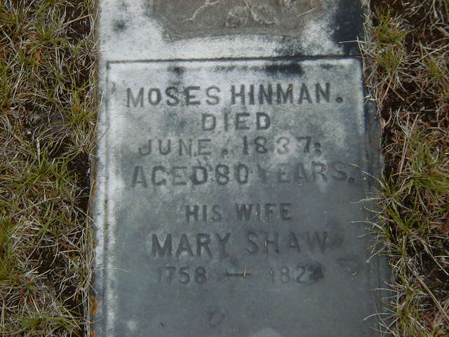 Date June 1837 per Burial. June 1836 per GEDCOM of Michael J. Kelly, May 4, 2005.1,2 He was buried on 3 June 1835 at Fairview Cemetery, Haldimand Twp., Grafton, Northumberland Co., Ontario; Memorial: (See Exhibit) Moses Hinman; Died; June 1837; Aged 80 Years; His Wife; Mary Shaw; 1758 - 182? (Fairview Cemetery, Grafton, May 23, 2005.)2