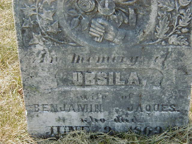 Ursula Linton was born in 1830; per GEDCOM of Kimberley Fraser, May 3, 2005.1 As of 3 February 1848,her married name was Jaques.1 She married Benjamin Jaques, son of John Jaques and Mary Ventress, on 3 February 1848 at Cramahe Twp., Colborne, Northumberland Co., Ontario; per GEDCOM of Kimberley Fraser, May 3, 2005.1 Ursula Linton died on 9 June 1869 at Cramahe Twp., Salem, Northumberland Co., Ontario; per GEDCOM of Kimberley Fraser, May 3, 2005.1 She was buried on 11 June 1869 at Salem Cemetery, Cramahe Twp., Salem, Northumberland Co., Ontario; Memorial: (See Exhbit) In Memory of; Ursila; Wife of; Benjamin Jaques; Who Died; June 3, 1869 ... (Salem Cemetery, June 5, 2005)