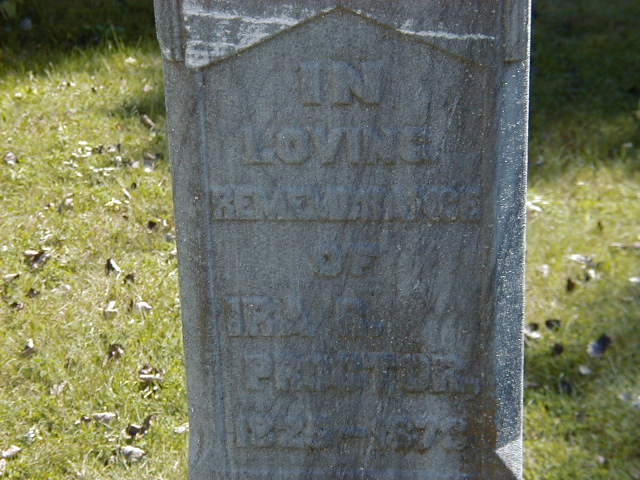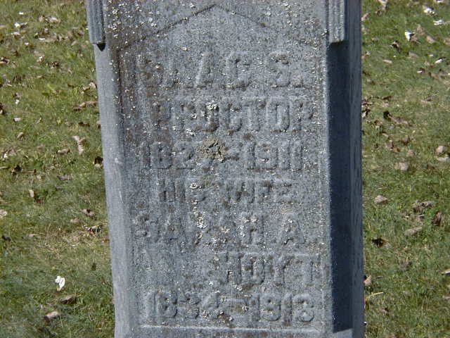 Isaac S. Proctor & wife sold 10 acres "south west part of the north west quarter", part of Conc 1, Lot 2, Brighton Twp., Northumberland Co. to Cornelius Valleau. ITS Date: Feb 24 1866. Reg'n. Date: Jul 14 1866. (Ontario Land Registry Records, Northumberland Co., Brighton Twp., Book 014, Pg. 098 of 210, Conc 1, Lot 2, Brighton Twp., page copied from OnLand.ca by Dan Buchanan Nov 6 2022.)10 He I. S. Proctor was the witness for a Deed of Land dated Aug 27 1870, for the sale of one acre of land, Lot One, East Side of Simpson Road, Conc 2, Lot 4, Brighton Township. Sophia (Simpson) Becker sold it to Matthew Becker of Hallowell Twp. (See Sophia (Simpson) Becker or Matthew Arthur.) on 27 August 1870 at Brighton, Northumberland Co., Ontario. He was "Proctor, Isaac S., grocer, Prince Edward St." per Lovell's Canadian Dominion Directory, 1871, pg 129 of 999 - ancestry.ca) in 1871 at Prince Edward St., Brighton, Northumberland Co., Ontario.6 He appeared on the census of April 1871 at Brighton, Northumberland Co., Ontario; Age 39 at 1871 Census: Proctor, I. Sanders, 39, b. Ont., Danish, CE, Grover, married; Sarah A., 35, b. Ont., Eng., Ce, married; George W., 6, b. Ont., Danish; Walter, 1.4 He lived on 15 October 1874 at Village Lot 6, Ontario St. East, Brighton, Northumberland Co., Canada West; Land Registry Records (Mortgage ) show that Isaac S. Proctor took a morgage on "said lot", Village Lot 6, Ontario St. West, Brighton Village, Northumberland Co. from John Eyre in the amount of $450. ITS Date: Oct 15 1874. Reg'n. Date: May 1 1875. (Ontario Land Registry Records, Northumberland Co., Brighton Twp., Book 005, pg. 158 of 296, page downloaded from OnLand.ca by Dan Buchanan, Oct 21 2024.)10 He lived on 28 September 1880 at Village Lot 5, Ontario St. East, Brighton, Northumberland Co., Ontario; Land Registry Records (Grant E1432) show that Isaac C. Proctor & wife sold Village Lot 5, Ontario St. West, Brighton Village, Northumberland Co. to Frederick W. Auston for $250. ITS Date: Sep 28 1880. Reg'n. Date: Sep 29 1880. (Ontario Land Registry Records, Northumberland Co., Brighton Village, Book 005, pg. 155 of 296, page downloaded from OnLand.ca by Dan Buchanan, Oct 21 2024.)10 He appeared on the census of April 1881 at Pelham Twp., Monck Co., Ontario; Age 50 at 1881 Census: Proctor, Isaac S., 50, b. Ont., Eng., CE, Mason, married; Sarah A., 45, b. Ont., Eng., Meth., married; George S., 16, b. Ont., Eng., Meth., son; Walter S., 11; Bessie M., 8 (1881 Census: Pelham Twp., Monck Co. (Welland Co.) - dist. 144, sub-dist. g-1, pg. 38, line 16 - ancestry.ca.)5 He appeared on the census of April 1891 at Brighton, Northumberland Co., Ontario; Age 61 at 1891 Census: Proctor, Isaac S., 61, b. Ont., p.b. US, Meth., Sherriff & Employee, married; Sarah A., 55, b. Ont., p.b. US & Ont., Meth., married; Walter S., 21, b. Ont., p.b. Ont., Meth., Clerk in dry goods store, single; Bernie M., 18, b. Ont., p.b. Ont., CE, single (1891 Census: Brighton Village dist. 98, sub-dist. b-2, pg. 18, line 1 - ancestry.com.)2 He appeared on the census of April 1901 at Brighton, Northumberland Co., Ontario; Age 71 at 1901 Census: Proctor, Sanders, 71, b. Ont. r. Oct 15 1831, Meth., CE, farm manager, married; Sarah, 63, b. Ont. r. Jul 7 1838, Meth., CE, married (1901 Census: Brighton Village, dist. 95, sub-dist. b-1, pg. 1, line 42 - ancestry.com.)7 He appeared on the census of 1911 at Brighton, Northumberland Co., Ontario; Age 81 at 1911 Census: Proctor, I. S.(m), 81, b. Ont. Nov 1829, Eng., Anglican, lab., married; Sarah A.?, 75, b. Ont. Jul 1835, Eng., Anglican, married; Auston, Bessie, 38, b. Ont. Feb 1872, Eng., Anglican, dressmaker, daughter, widow; Charles F., 11, b. Ont. Sep 1899, grandson; John S., 9, b. Ont. Apr 1902, grandson (1911 Census: Brighotn Village dist. 101, sub-dist. 31, pg. 1, line 8 - ancestry.com.)9 He died on 7 December 1911 at Brighton, Northumberland Co., Ontario, at age 84; Date 1911 per Burial. Date Dec 7 1911 & location Brighton per family tree of sandswise on ancestry.ca, Jun 17 2017.3,11 He was buried on 9 December 1911 at Mount Hope Cemetery, Brighton, Northumberland Co., Ontario; Memorial: (See Exhibit) Isaac S; Proctor; 1827 - 1911; His Wife; Sarah A; Hoyt; 1834 - 1913 (Mount Hope Cemetery, Brighton, Sep 26, 2004.)3