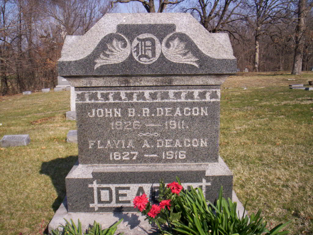 "In the Sentinel of October 28, 1853, the following notice appeared: "Married by Rev. J. black at the residence of Ira R. Proctor, 27 October, Mr. John b. R. Deacon, Merchant, to Miss Flavia Almira, only daughter of the late Mr. Josiah Proctor - all of village of Brighton. We wish the couple much happiness and render our thanks for a nice slice of the $10.00 brides cake sent to the Printers."" from page 286 of The Tobey Book, Brighton Public Library.1,6 John Beverly Robinson Deacon appeared on the census of April 1861 at Brighton Twp., Northumberland Co., Canada West; Age 32 at 1861 Census: Deacon, J. B. R., 32, b. UC, FC, Merchant, married; Flavia, 30, b. UC, Fc, married; Andrew, 7, b. Cw; William, 4; Harriet, 2; Jane, 29.7 He appeared on the census of 13 July 1870 at Grand River Twp., Harrisonville, Cass Co., Missouri, U.S.A; Age 43 at 1870 Census: Deacon, John, 43, b. Cda., father of foreign birth, hardware merchant, married; Flavia, 40, b. cda., both parents foreign birth, married; John, 5, b. Cda; Alma, 5; Andrew, 27, b. Cda., father foreign born, hardware merchant; Amanda, 70, b. New York, Retired House Keeper; Jane, 32, b. Cda., no occ. (familysearch.org.)3 He lived on 16 October 1876 at Village Lot 9, Main St. North, Brighton, Northumberland Co., Ontario; Land Registry Records (B&S 907) show that Flavia A. Deacon & John B. R. Deacon sold part of Village Lot 9, Brighton Village, Main St. North side, Northumberland Co. to Clarinda Squier (widow). ITS Date: Oct 16 1869. Reg'n. Date: Jul 27 1870?. (Ontario Land Registry Records, Northumberland Co., Brighton Village, Book 004, Pg. 308 of 399, Village Lot 9, Main St. North Side, (conc 2, Lot 2, Brighton Twp.) page copied from OnLand.ca by Dan Buchanan Apr 13 2023.)8 He appeared on the census of 1880 at Harrisonville, Cass Co., Missouri, U.S.A; Age 52 at 1880 Census: Deacon, John B. R., 52, b. Cda., parents b. Cda. & NY, Merchant, married; Flavia, 51, b. Cda., parents b. NY & Cda., married; J. B. R., 16, b. Cda., parents b. Cda., son; Allie, 16, b. Cda., parents b. Cda., daughter (familysearch.org.)3 He died on 21 March 1911 at Harrisonville, Cass Co., Missouri, U.S.A., at age 84; Date Mar 21 1911 & locaiton Harrisonville, Missouri per findagrave. Date Mar 21 1911 & location Harrisonville, Missouri per family tree of deeplace on ancestry.ca, June 29, 2017.2,4 He was buried on 24 March 1911 at Oakland Cemetery, Harrisonville, Cass Co., Missouri, U.S.A; "Birth: Nov. 21, 1826, Canada; Death: Mar. 21, 1911, Harrisonville, Cass County, Missouri, USA; Same Stone with Flavia A Deacon; Family links: Parents: Amanda Cory Deacon (1800 - 1880); Spouse: Flavia A Deacon (1827 - 1916); Siblings: John B Deacon (1826 - 1911); Eliakim Cory Deacon (1829 - 1913)*; Jane M. Deacon (1832 - 1921)*; Andrew G Deacon (1841 - 1914)*; Burial: Oakland Cemetery, Harrisonville, Cass County, Missouri, USA; Plot: Orginal North section East of Commercial St; Created by: Tom C; Record added: Jul 26, 2003; Find A Grave Memorial# 7711376" from https://www.findagrave.com/cgi-bin/fg.cgi?page=gr&GRid=7711376&ref=acom (Image of memorial added by Jaime Crandell-Stapleton 6/25/2006.)4