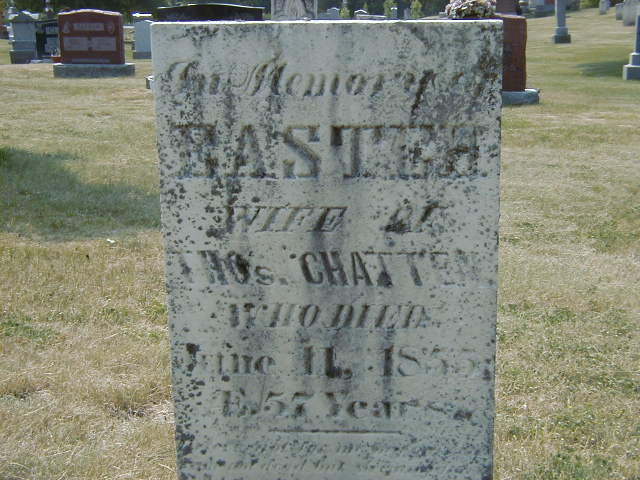 CEMSearch: Name: Easter Chatten; Maiden: ? ; Born -; Died: 1855-06-11; Notes: Wife of Thomas Chatten; Buried: Salem Cemetery, Sec NE; No other names.2,7