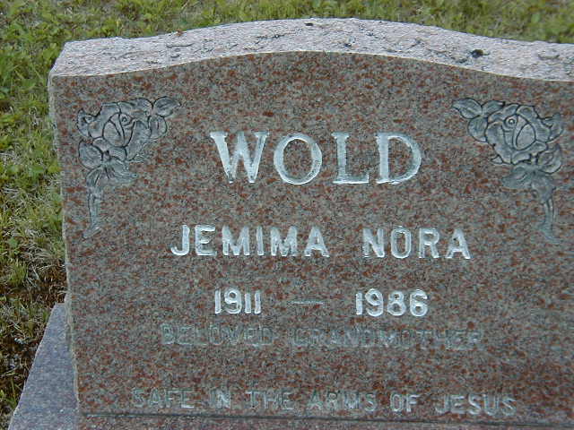 Date 1911 per Burial. per Death info - from Marie Sparling, Nov 2004.1,2,3 She married Alfred Wold before 1925; per Death info - from Marie Sparling. As of before 1925,her married name was Wold. Jemima Nora Shirk died on 20 June 1986 at Teefy Twp., Porquis Junction, Cochrane Dist., Ontario, at age 74; Date June 20 1986 per email from Stephen Shirk, Dec 13, 2005. Date 1986 per Burial.1,2 She was buried on 23 June 1986 at Porquis Union Cemetery, Porquis Junction, Cochrane Dist., Ontario; Memorial: (See Exhibit) WOLD; Jemima Nora; 1911 - 1986 (Porquis Union Cemetery, Porquis Junction Cemetrey, July 2, 2005.)1