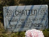 CEMSearch: Name: Thomas Chatten; Born: 1865; Died: 1926; Notes: Husband of Annie Hawley; Buried: Salem Cemetery, Se cNW; Other name: Annie Chatten (Hawley) (1865-1941) per GEDCOM of Teresa Smith, June 1, 2005.2,9,11