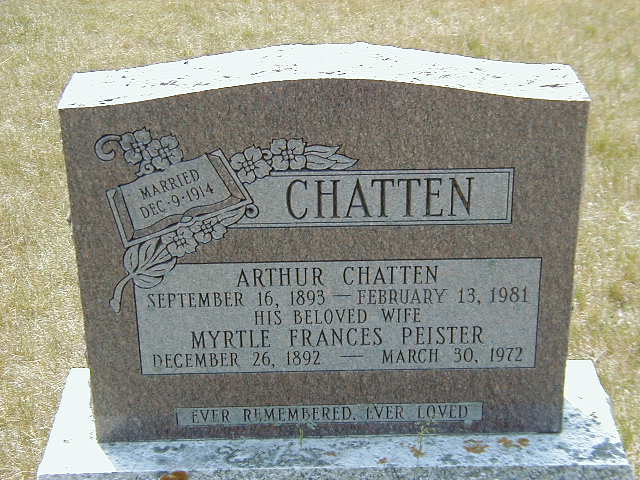 CEMSearch: Name: Arthur Chatten; Born: 1893-09-16; Died: 1981-02-13; Notes: Husband of Myrtle Frances Peister; Buried: Salem Cemetery, Sec SW; Other names: Myrtle Frances Chatten (Peister) (1892-1972.)2,14