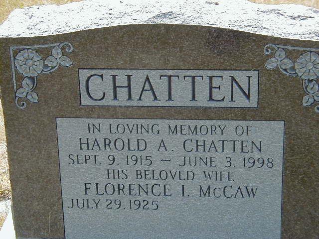 Harold Arthur Chatten was born on 9 September 1915 at Brighton Twp., Northumberland Co., Ontario; Date 1916 & location Ont. per 1921 Census. "Chatten; A son born September 9, 1915, to Mrs. Arthur; Sept. 17, 1915" per Index of The Brighton Ensign, Sept. 17, 1915, Trenton Public Library, June 5, 2005. Date Sep 9 1915 per Burial. Date Sep 9 1915 per GEDCOM of Teresa Smith, June 2, 2005.1,2,3,4 He appeared on the census of 1921 at Brighton Twp., Northumberland Co., Ontario; Age 5 at 191 Census: see Arthur Chatten.4 He lived in 1940 at Brighton Twp., Hilton, Northumberland Co., Ontario; "15 Chatten, Harold, farmer, Hilton" Canada Voter Lists 1940, Brighton Twp., pg. 25 of 124, ancestr.ca.5 He lived in 1945 at Brighton Twp., Hilton, Northumberland Co., Ontario; "30 Chatten, Harold, soldier, Hilton" Canada Voter Lists 1945, Brighton Twp., pg. 85 of 178, ancestr.ca.5 He lived in 1962 at Dewitt Rd., Hamilton, Wentworth Co., Ontario; "12 Chatten, Harold, tool & die maker, R.R. 2 S.C" & "131 Chatten, Mrs. Florence, R.R. 2, S.C." Canada Voter Lists, 1962, Wentworth Co., Saltfleet No 14, pg. 275 pf 444, ancestry.ca.5 He lived in 1972 at 201 Dewitt Rd., Hamilton, Wentworth Co., Ontario; "201 Chatten, Harold, machinist ... 28" & "201 Chatten, Mrs. Florence ... 29" Canada Voter Lists, 1972, Hamilton City, pg. 400 pf 555, ancestry.ca.5 He was retired in 1976 at Hamilton, Ontario; "Retired in 1976 from the International Harvesters Co., in Hamilton, Ont. after 36 years as a Tool and Die Maker." per "Book of Descendants", copied from book given to me by Florence Chatten, June 5, 2005. He died on 3 June 1998 at Peterborough, Ontario, at age 82; Date Jun 3 1998 & location Peterborough per "Book of Descendants", copied from book given to me by Florence Chatten, June 5, 2005. Date June 3 1998 per Burial.2 He was buried on 6 June 1998 at Salem Cemetery, Cramahe Twp., Salem, Northumberland Co., Ontario; Memorial: (See Exhibit) CHATTEN; In Loving Memory of; Harold A. Chatten; Sept. 9, 1915 - June 6, 1998; His Beloved Wife; Florence I. McCaw; July 29, 1925 - (Salem Cemetery, June 5, 2005.)2