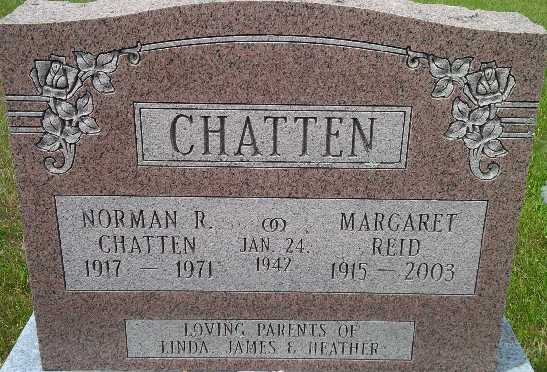 Date 2003 per Memorial.3 She was buried on 3 October 2003 at Hilton Cemetery, Brighton Twp., Hilton, Northumberland Co., Ontario; Memorial: (See Exhibit) CHATTEN; Norman R. Chatten; 1917 - 1971; Margaret Reid; 1915 - 2003.. Jan 24 1942; Parents of... Heather (Hilton Cemetery, July 10, 2004)