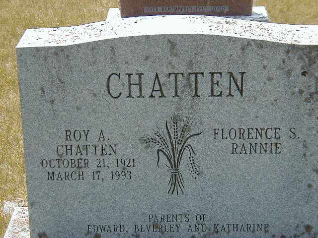 CEMSearch: Name: Roy A. Chatten; Born: 1921-10-21;; Died: 1993-03-17; Notes: Husband of Florence S. Rannie, father of Edward, Beverly and Katharine; Buried: Salem Cemetery, Sec SW; Other name: Florence S. Chatten (Rannie)