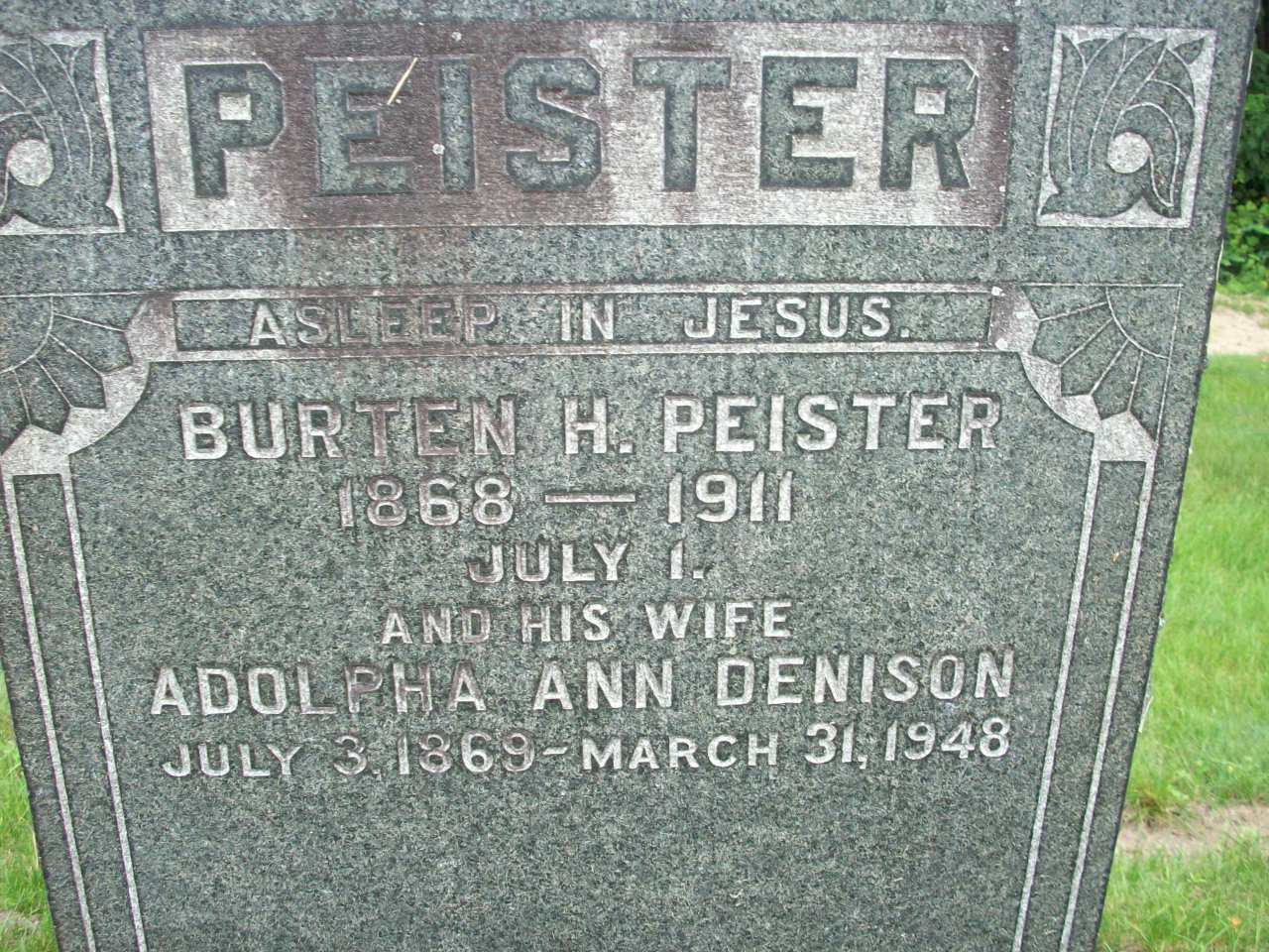 Burten Henry Peister was born on 1 July 1868 at Brighton Twp., Northumberland Co., Ontario; Date 1868 per Memorial. Date Jul 1868 & location Ont. per 1911 Census. Date Jul 1 1869 per 1901 Census. Date 1869 per 1881 Census.1,4,5,3 He appeared on the census of April 1871 at Brighton Twp., Northumberland Co., Ontario; Age 2 at 1871 Census: see Henry Peister.6 He appeared on the census of April 1881 at Brighton Twp., Northumberlalnd Co., Ontario; Age 12 at 1881 census: see Henry Peister.1 He appeared on the census of April 1891 at Brighton Twp., Northumberland Co., Ontario; Age 22 at 1891 Census: see Henry Peister.7 He married Adolpha Anna Denison, daughter of John Wesley Denison and Phebe Jane Thorn Casey, on 18 January 1897 at Lennox & Addington Co., Ontario; Marriage Reg'n.: Groom: Burton H. Peister; Age: 27; Res. & Born: Brighton; Status: bachelor; Occ.: farmer; Parents: Henry Peister & Phebe Sharp; Bride: Adolpha A. Denison; Age: 26; Res. & Born: Richmond; Status: spinster; Parents: John Denison & Phoebe Casey; Wit.: ---; Date: 1897; Place: Lennox & Addington Co. (Ontario Marriage Registration, ancestry.com) per 1901 Census.
